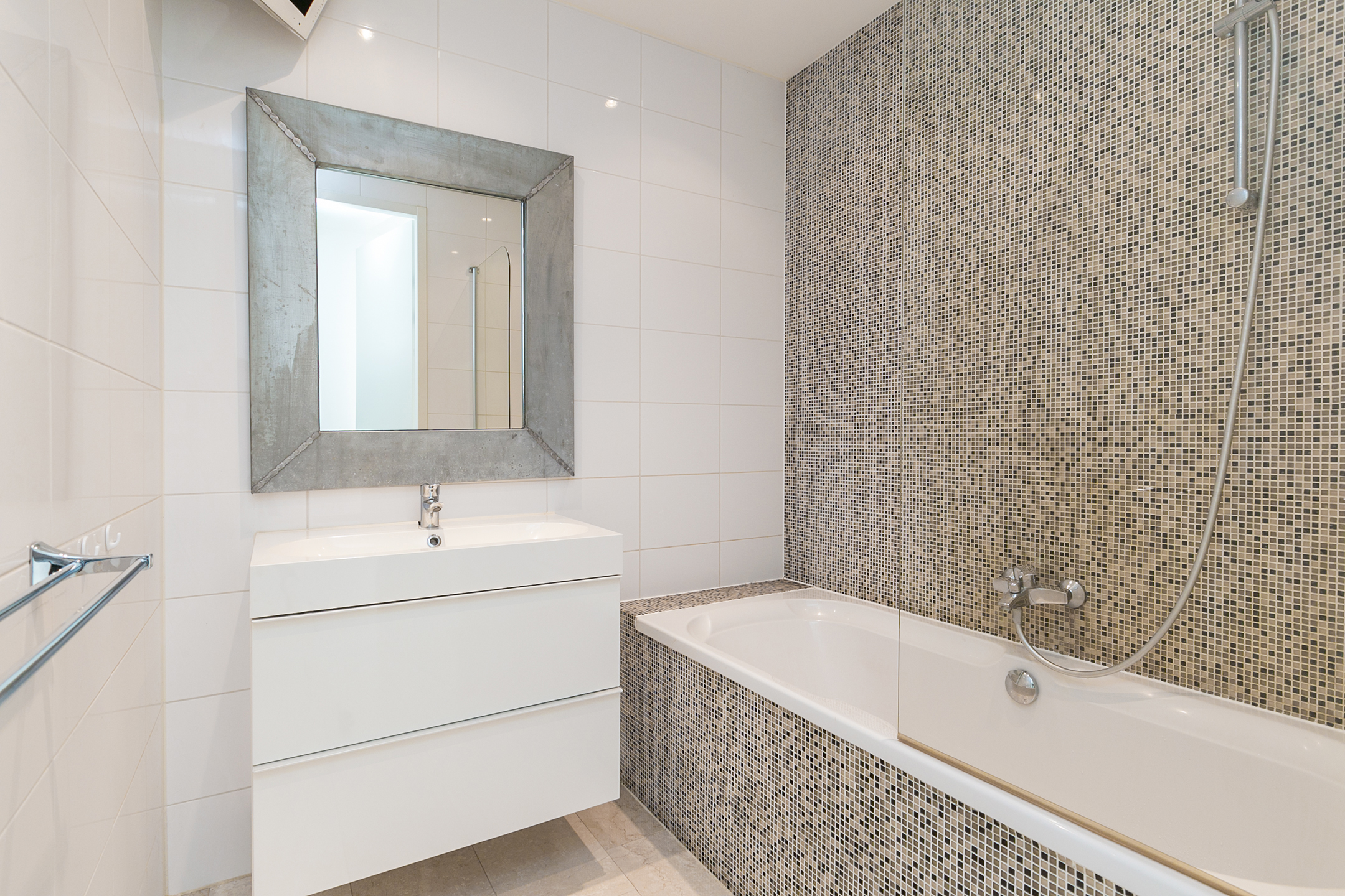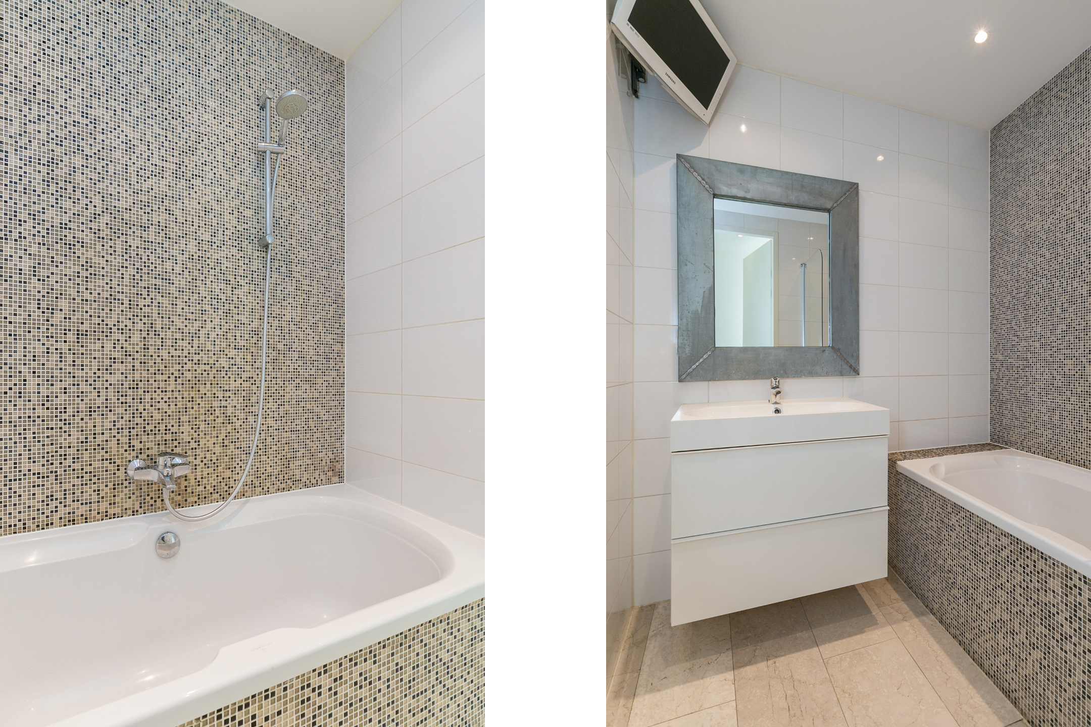 Aan de achterzijde van het appartement bevindt zich de ruime slaapkamer inclusief inloopkast. Daarnaast is er nog een tweede kamer van circa 5 m², ideaal als werkplek of inloopkast. Door het plaatsen van een tussenwand kan de kamer gemakkelijk worden verdeeld in twee slaapkamers. Het vrije uitzicht en de grote raampartijen zorgen ervoor dat beide kamers ruim en licht blijven. De badkamer is voorzien van een ligbad en een wastafel en ligt centraal in de woning.