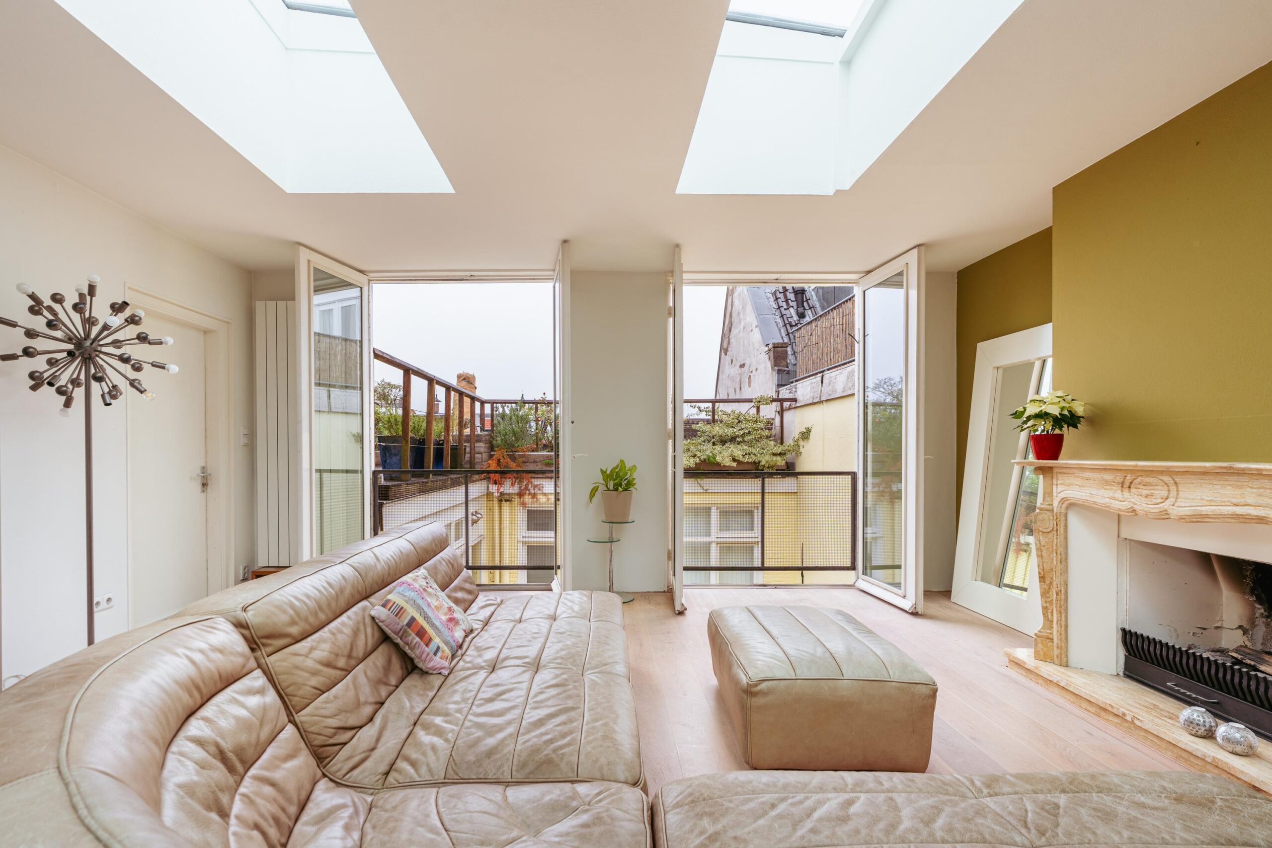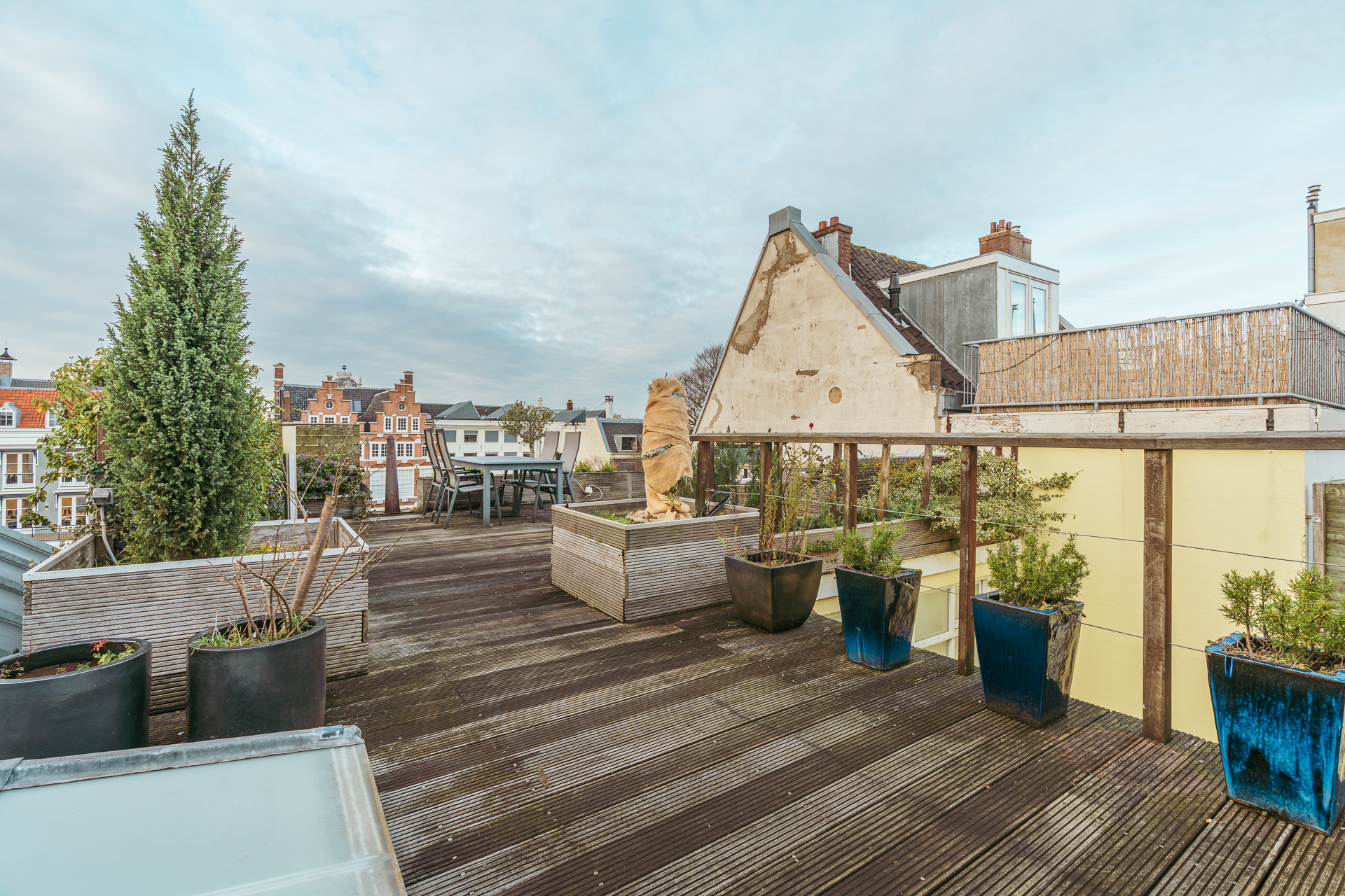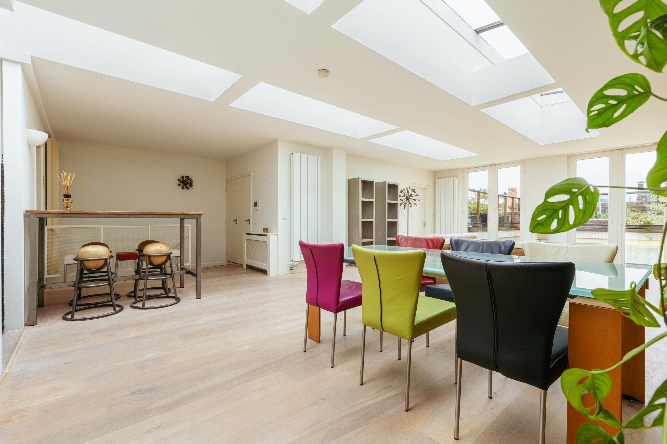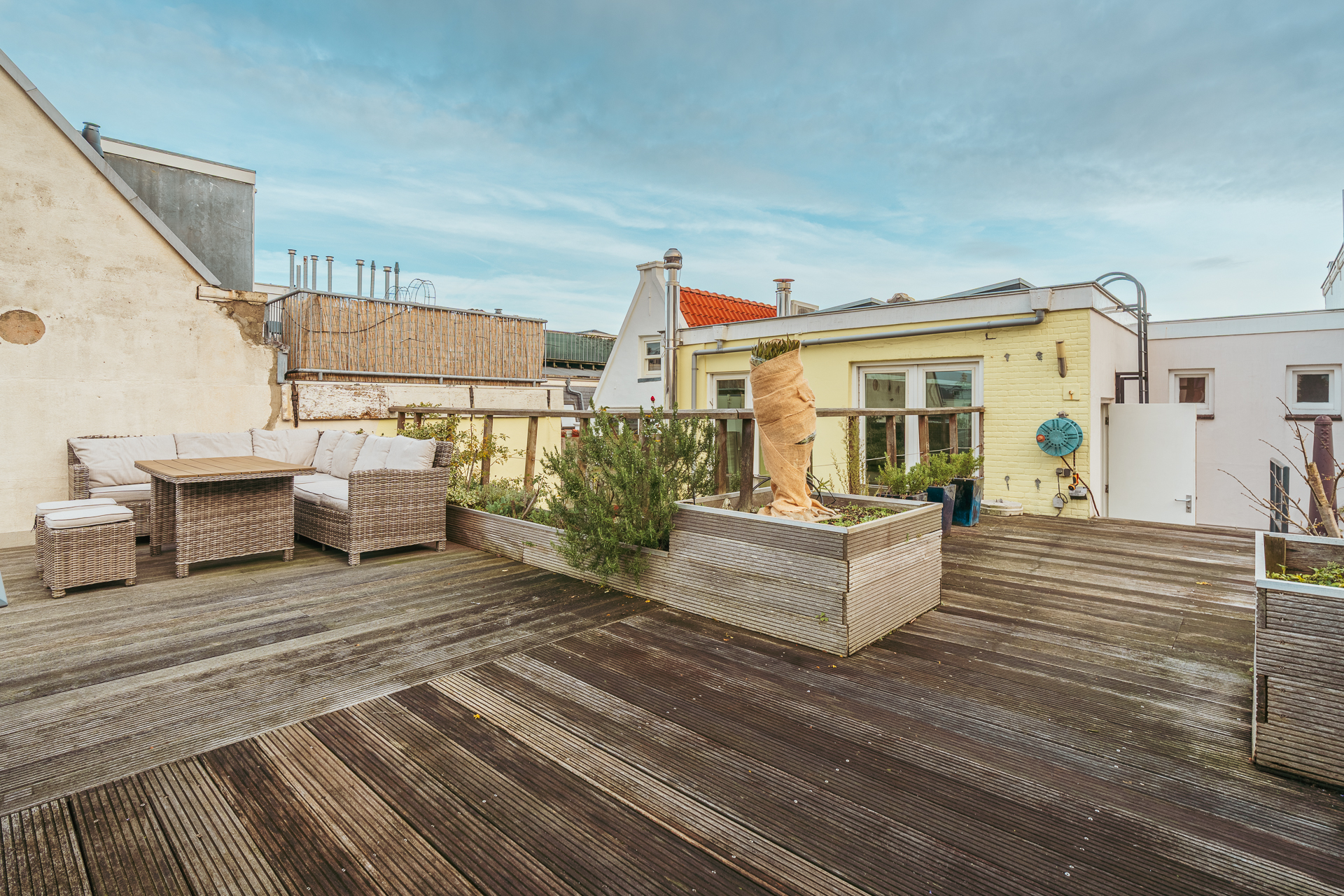 A unique and almost secret loft apartment on the top floor of a beautiful national monument, complete with a roof terrace of over 60 m². This exclusively located 3-room apartment offers exceptional privacy and a remarkably bright living experience thanks to the long sightlines and the generous skylights that illuminate the entire house. The apartment of approximately 109 m² is located on the third and highest floor and directly connects to an impressive roof terrace that extends across the entire terrace and rear of the house. The apartment has been largely renovated, has a sleek finish, and the height and open structure give it the feel of a true loft. Definitely not a standard apartment. The national monument in which it is located also has a special quality: the above-average width of the building. Authentic details are particularly evident in the characteristic façade, the entrance, the staircase, the marble work, the hallway, and the generous proportions.