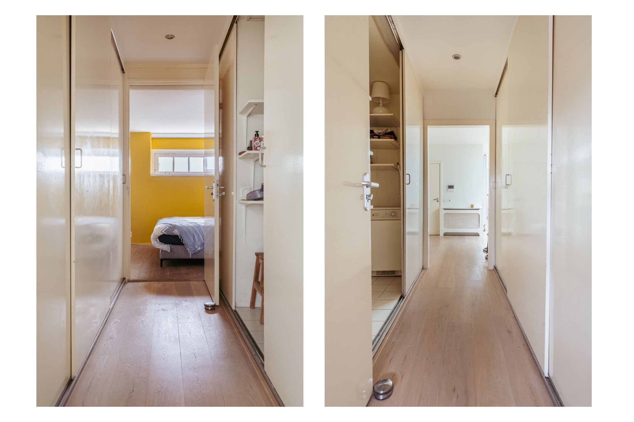 The third floor of Herengracht 116-L consists of a spacious living level with two bedrooms at the front overlooking the canal. Both bedrooms have air conditioners. The largest bedroom is located at the front right and has a slightly smaller bedroom located at the front left. Between them is a central area with several closets, a laundry room, and a hallway that provides access to the rest of the floor. At the rear of this area are the bathroom and the kitchen, both directly adjacent to the large living room.