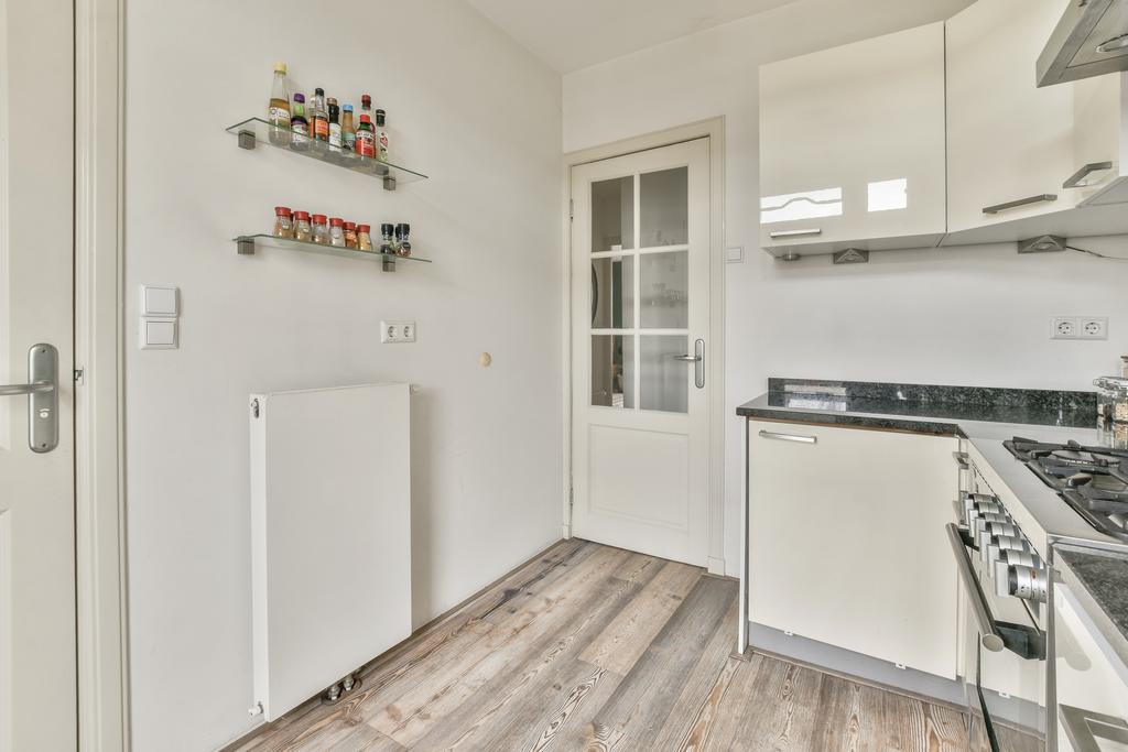 Entree, hal, toilet met fonteintje, en een inpandige berging met wasmachine en droger. De sfeervolle woonkamer, met veel licht, bevindt zich aan de straatkant. De aparte keuken is uitgerust met diverse inbouwapparatuur en een granieten werkblad. Vanuit de keuken heeft u toegang tot zowel het balkon als de badkamer, met een douche en wastafelmeubel. De slaapkamer ligt aan de achterkant en beschikt over 3 ruime inbouwkasten en openslaande deuren naar het balkon.