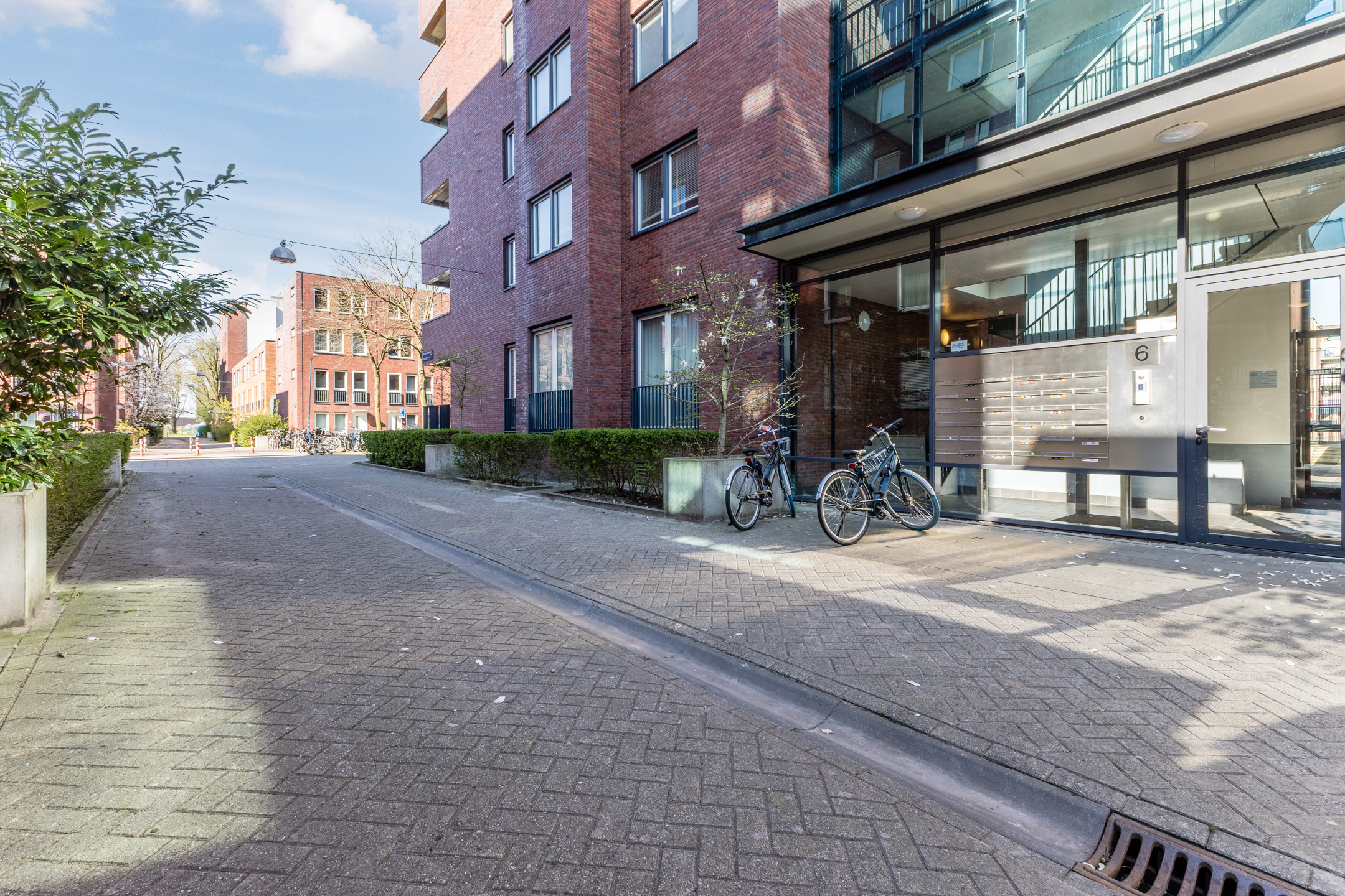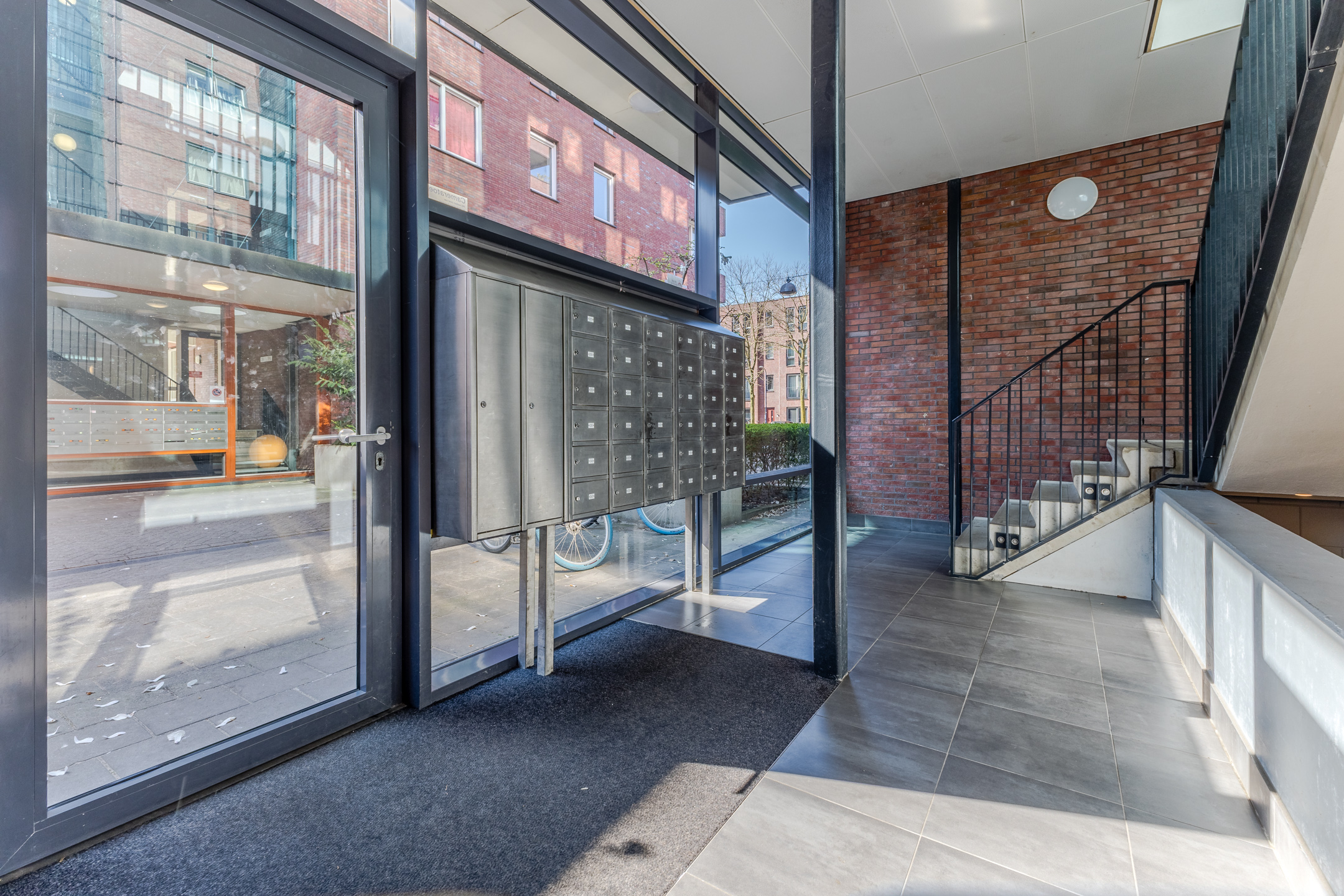 Centrale entree met afgesloten toegang, intercom, brievenbussen en toegang tot de lift, het trappenhuis en de bergingen.