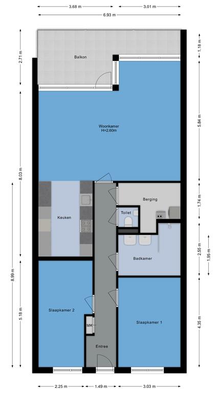 Entree op de tweede verdieping met royale hal en meterkast. Ruime woonkamer met toegang tot het zonnige west balkon. De halfopen luxe keuken is voorzien van diverse inbouwapparatuur, waaronder een vaatwasser, twee koel-/vriescombinaties, schouwkap, kookplaat, oven, combimagnetron en Quooker. Vanuit de hal zijn twee ruime slaapkamers bereikbaar, evenals de moderne badkamer met inloopdouche en wastafelmeubel, een separaat hangend toilet met bidetfunctie en fontein, en een praktische bergkamer met wasmachineaansluiting.