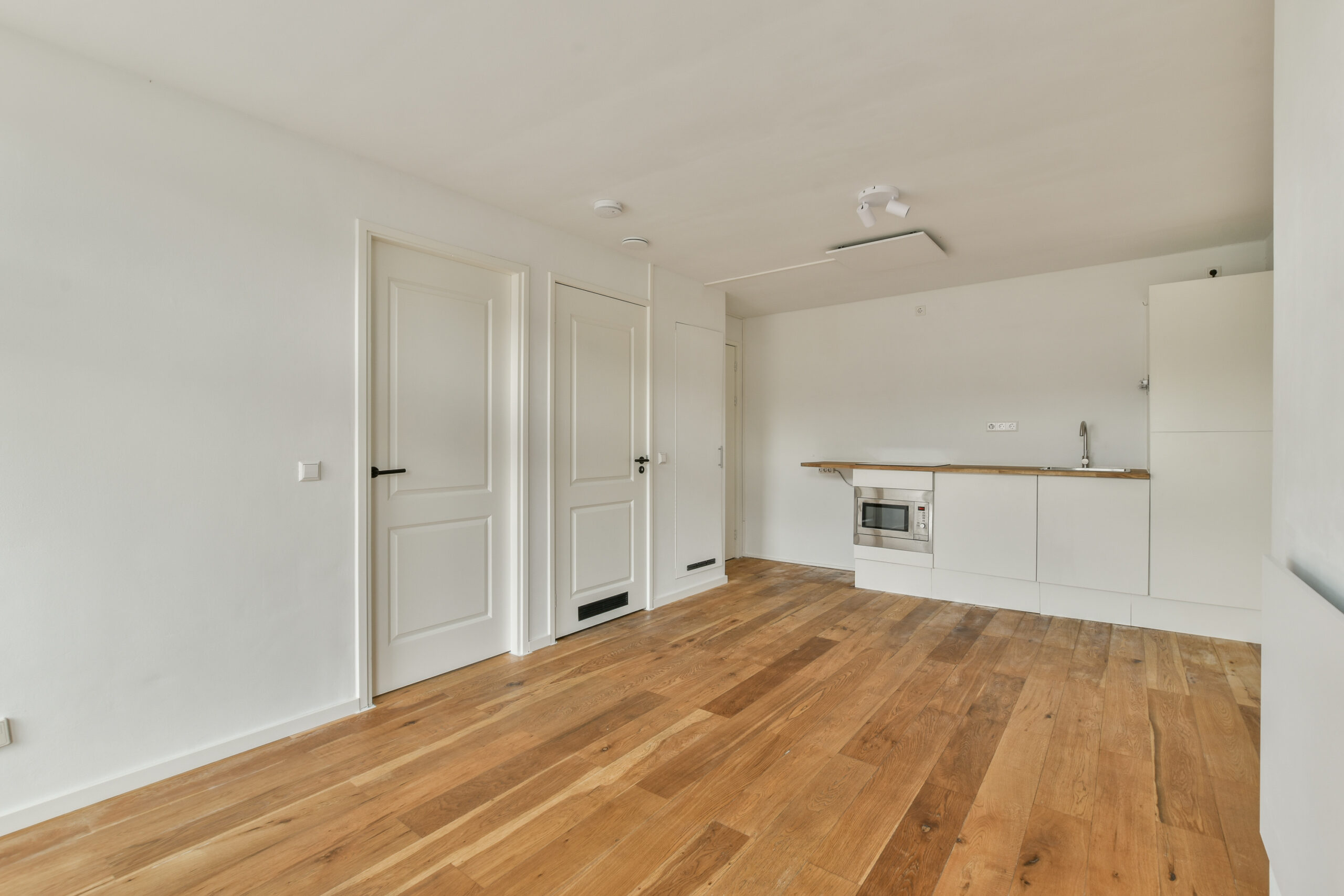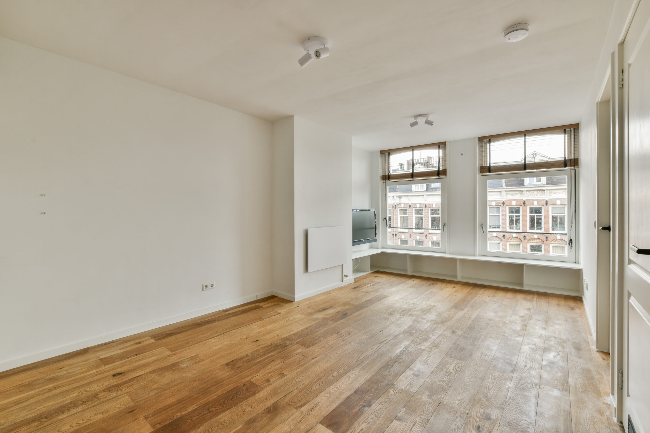 Through the communal staircase, you reach the apartment on the fourth floor at the front of the building. Upon entering, you step directly into the living room with an open kitchen at the rear. A striking feature is the large windows, which bring in abundant natural light. The space allows for both a seating and dining area.
