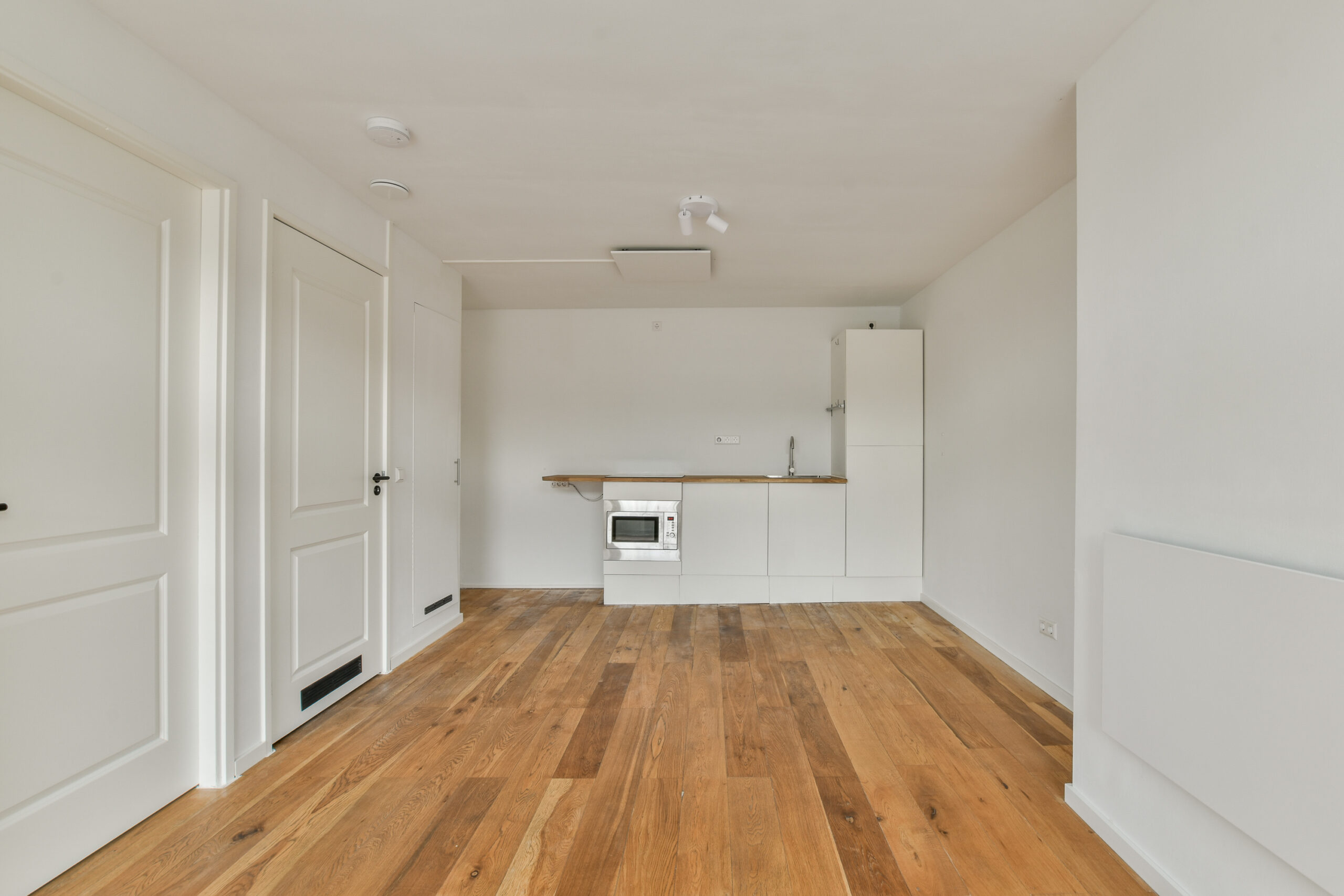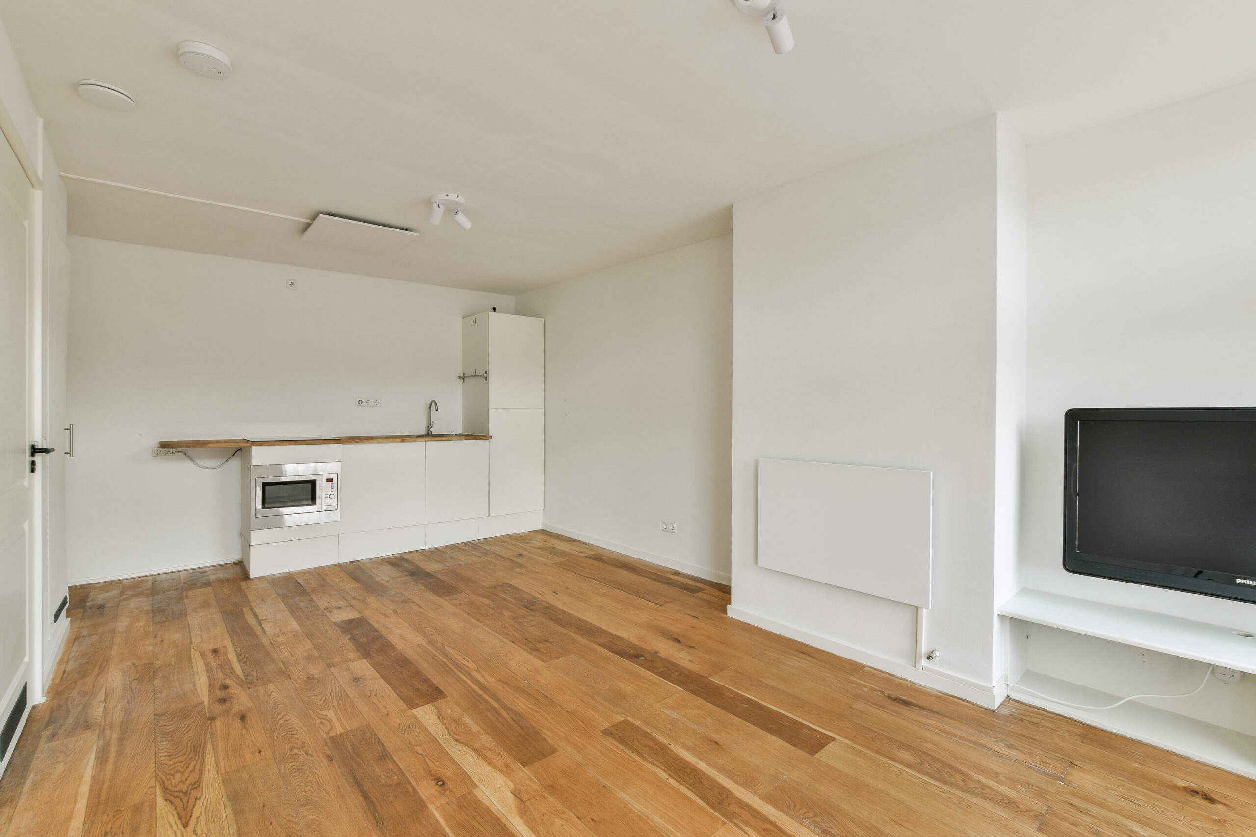Via het gemeenschappelijke trappenhuis bereik je het appartement gelegen op de vierde verdieping aan de voorzijde van het pand. Eenmaal binnen kom je direct in de woonkamer met openkeuken aan de achterzijde. Wat opvalt zijn de grote raampartijen met dito lichtinval. Hier is ruimte voor zowel een woon/zithoek als eetgedeelte. De keuken is voorzien van een 4-pits inductiekookplaat en koel-vriescombi. Aansluiting en ruimte voor een was-droogcombi is aanwezig onder het aanrecht. Het plaatsen van een vaatwasser behoort eveneens tot de mogelijkheden.