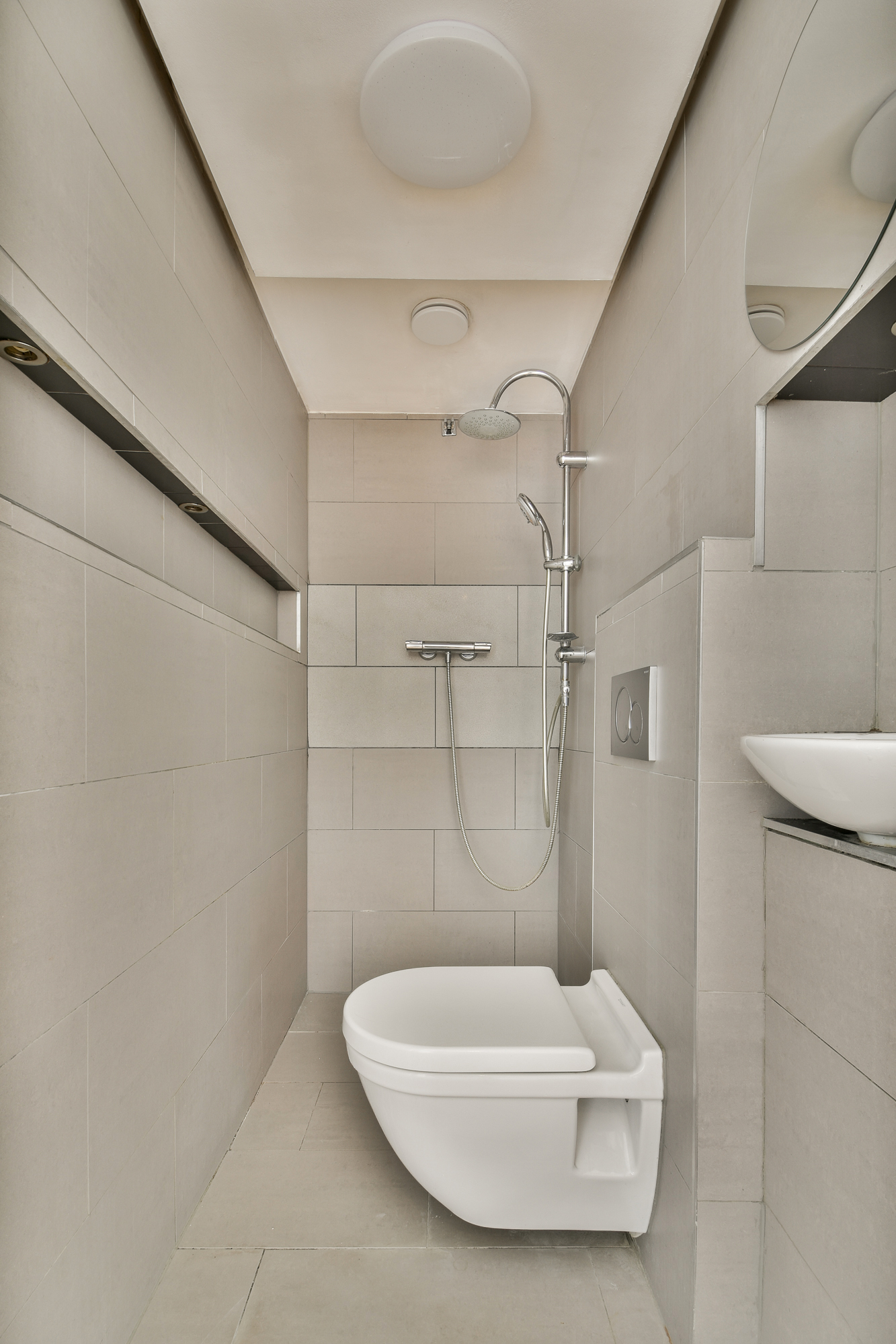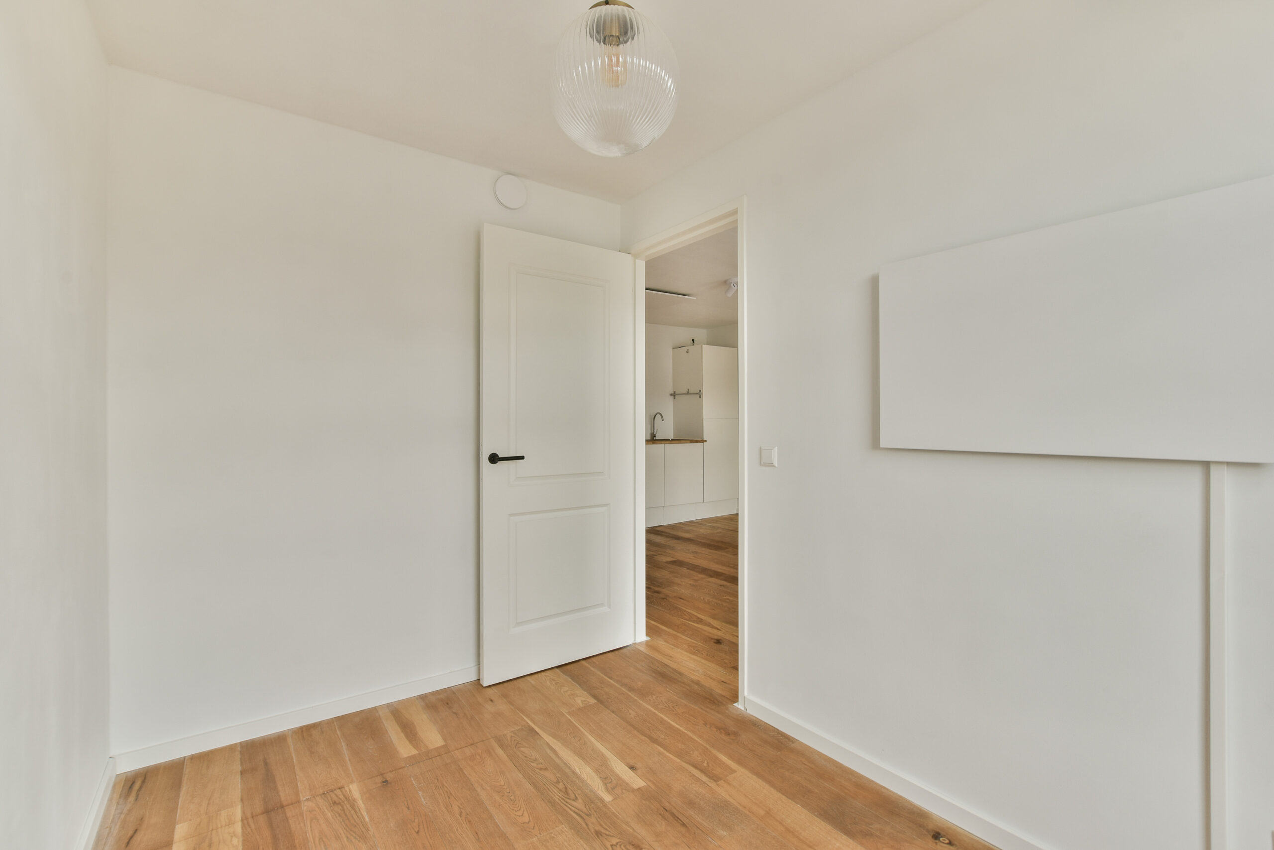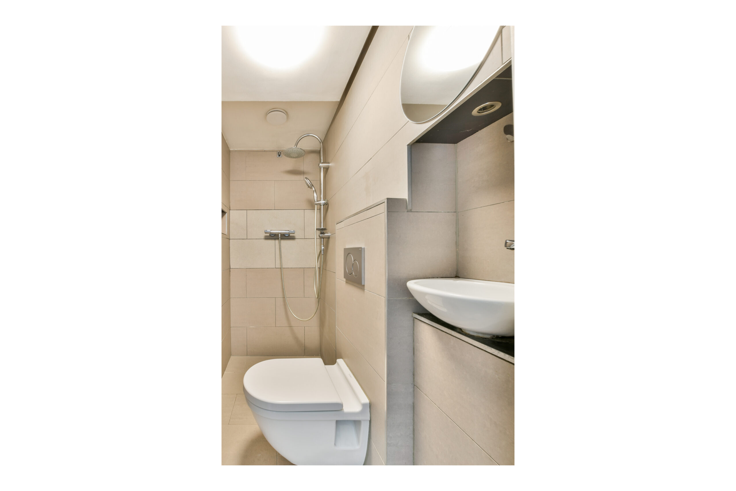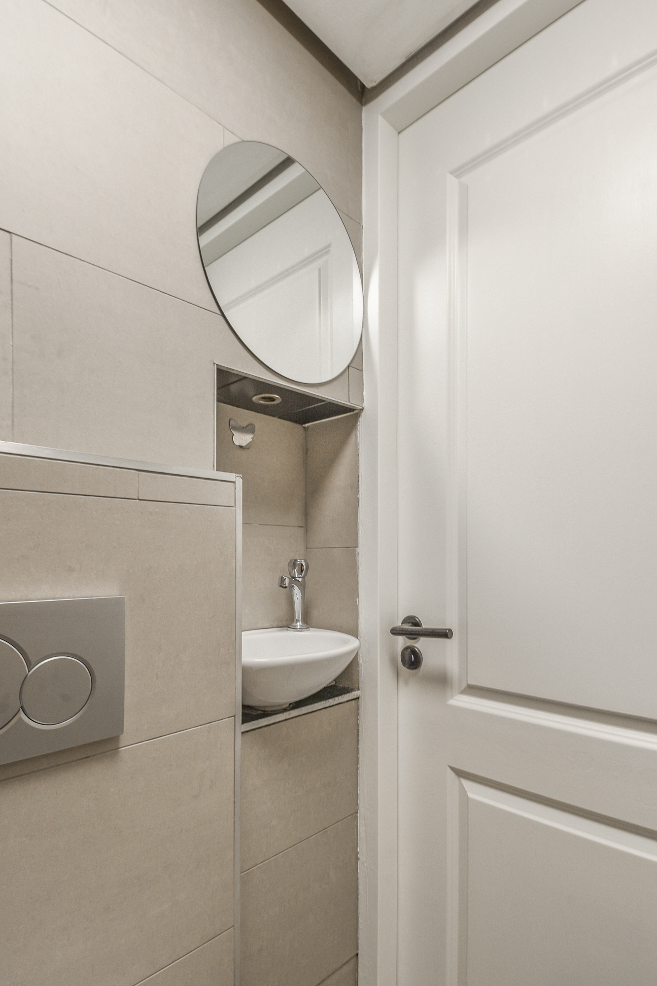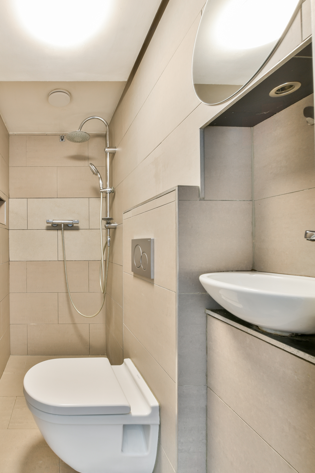 Direct aan de woonkamer bevinden zich twee deuren naar de badkamer en de slaapkamer. De badkamer is modern en stijlvol afgewerkt en voorzien van een inloopdouche, toilet en kleine wasbak. De compacte slaapkamer bevindt zich aan de voorzijde en biedt ruimte voor een tweepersoonsbed en kledingkast. Dankzij de grote ramen voelt het, ondanks het beperkte oppervlak, licht en ruimtelijk aan.