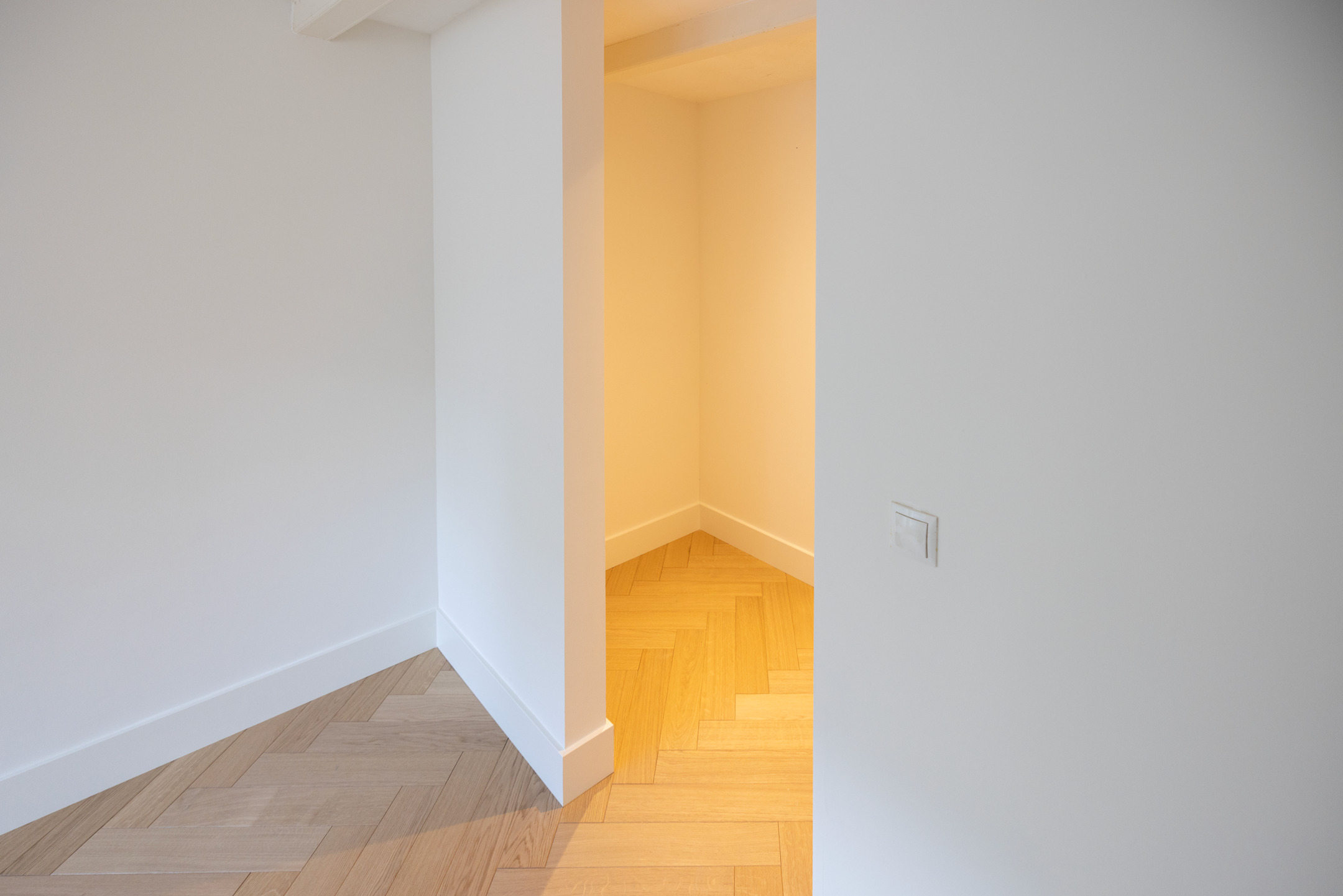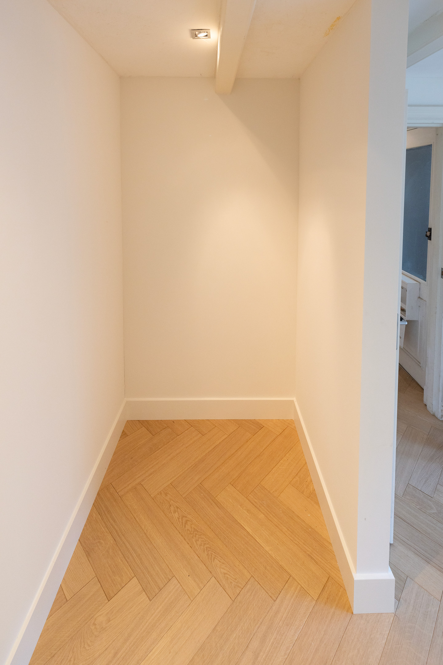 U komt binnen in de hal, die toegang geeft tot alle vertrekken. Aan de voorzijde van het appartement bevindt zich de lichte slaapkamer, voorzien van een ruime inloopkast/kantoorruimte. Achter de slaapkamer ligt de goed onderhouden badkamer met ligbad, douche, dubbele wastafel en toilet. Vanuit de hal is ook een aparte bergkast bereikbaar met aansluitingen voor wasmachine en droger.