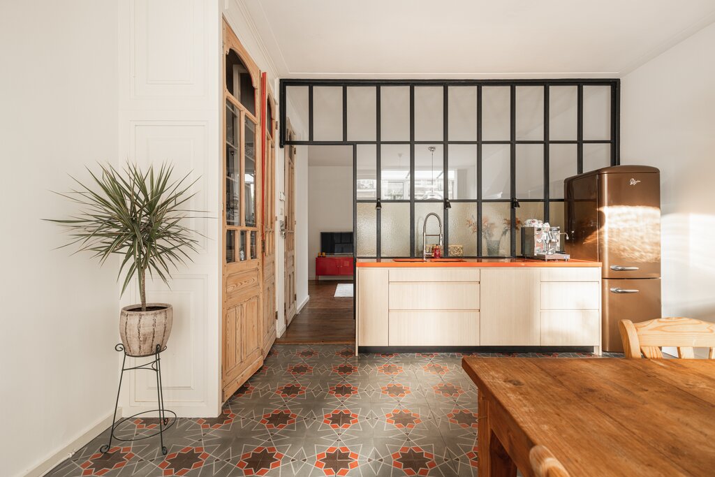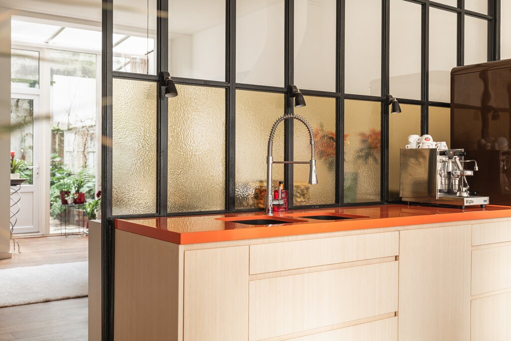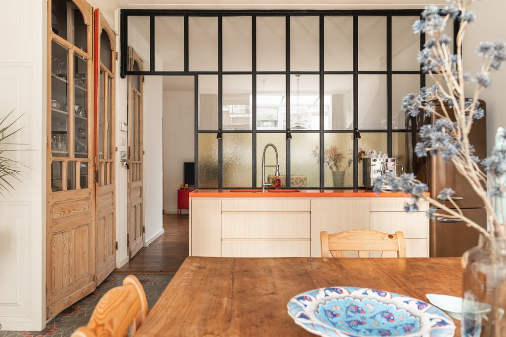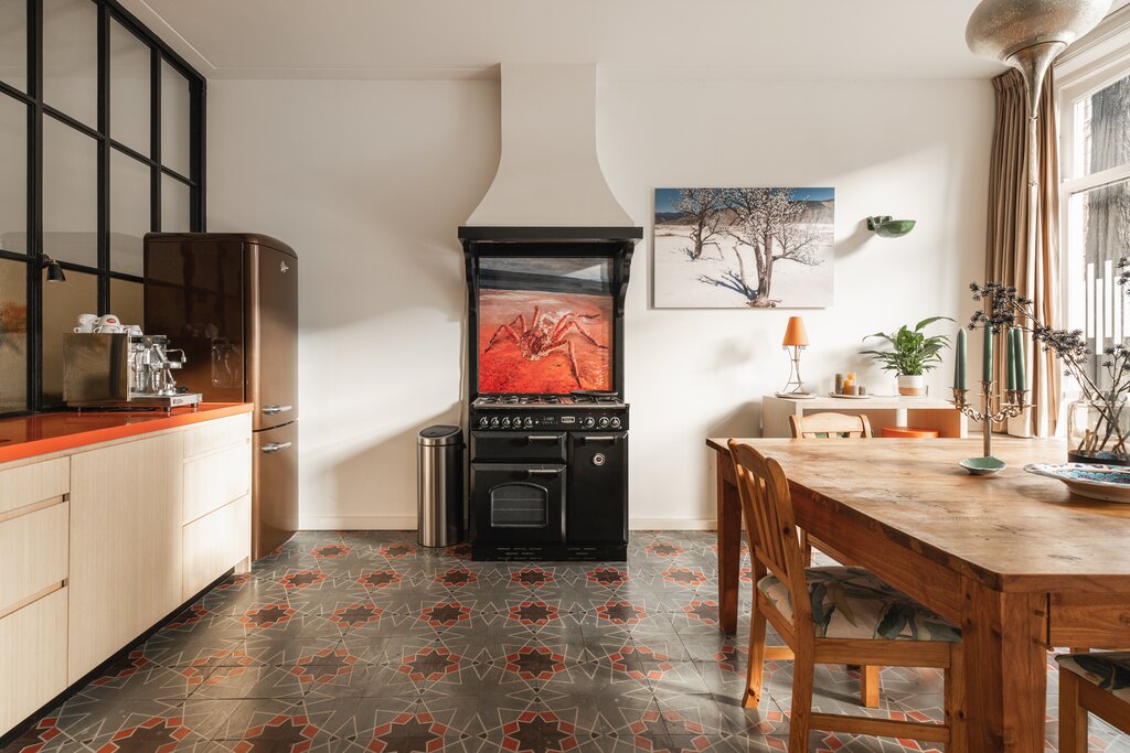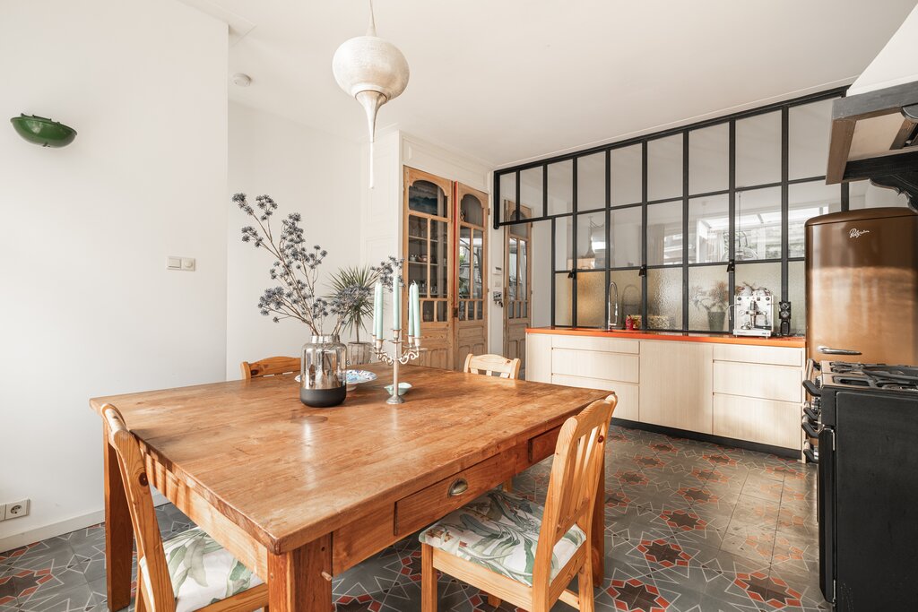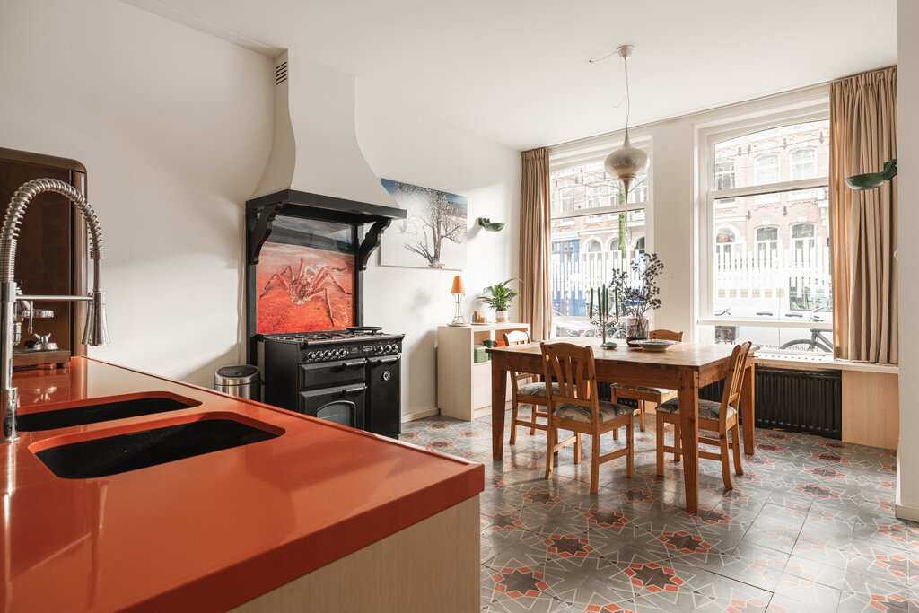 U komt binnen via een eigen entree in de ruime woon-/eetkeuken (gerenoveerd in 2013). In de keuken vindt u handgemaakt bamboe meubilair, een modern composiet aanrechtblad met dubbele wasbak, Falcon gasfornuis met dubbele oven, afzuigkap, vaatwasser en eigen boiler. U ziet een hoge keukenkast met authentieke Italiaanse deuren voor uw glaswerk en een fraai betegelde vloer. De keuken heeft ochtendzon, waarbij u heerlijk op de ruime vensterbank kunt genieten van de levendige Plantagebuurt.