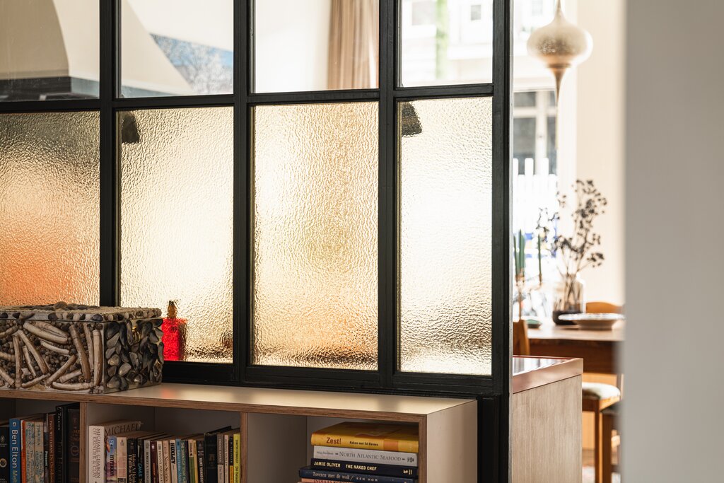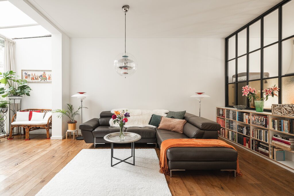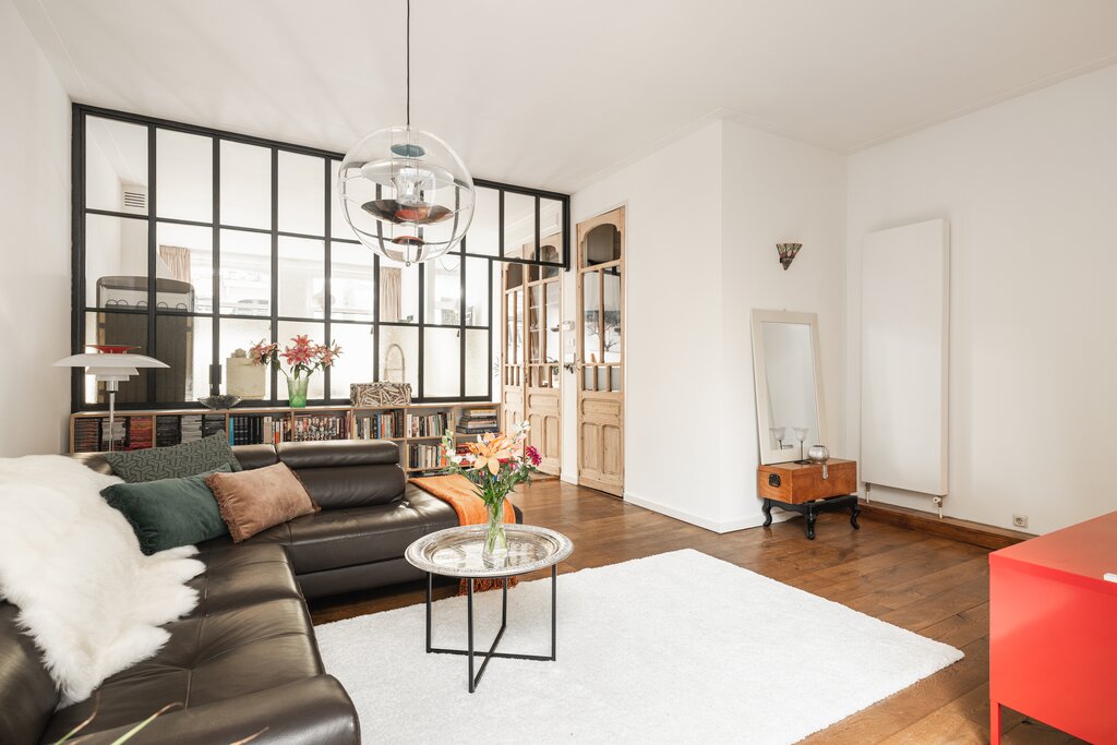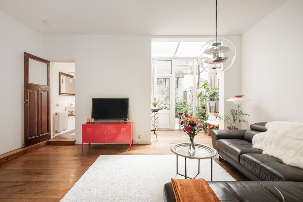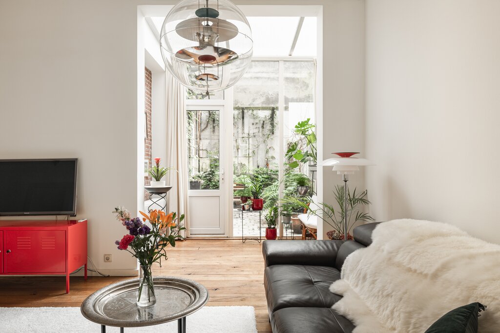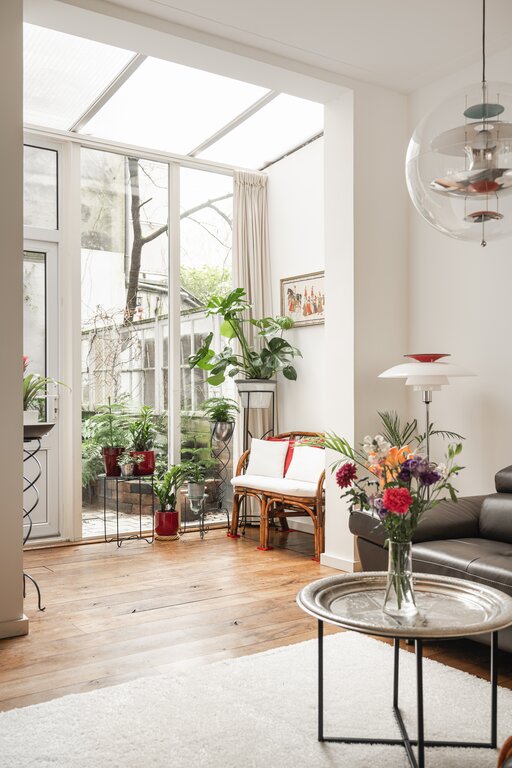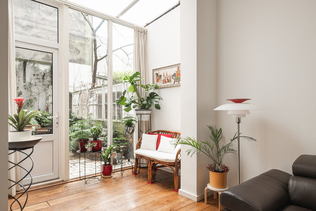 De woonkamer is zeer ruim van opzet met hoge plafonds en een sfeervolle houten vloer. De woonkamer biedt tevens toegang tot het gastentoilet met fonteintje en een handige bergruimte. Een stijlvolle glazen wand tussen keuken en woonkamer zorgt voor optimale balans van lichtinval tussen voor- en achterhuis. Achterin de woonkamer bevindt zich een aangebouwde lichte erker met toegang tot de tuin op het westen met avondzon. In de professioneel aangelegde tuin (2020) kunt u prettig buiten zitten in verrassende stilte.