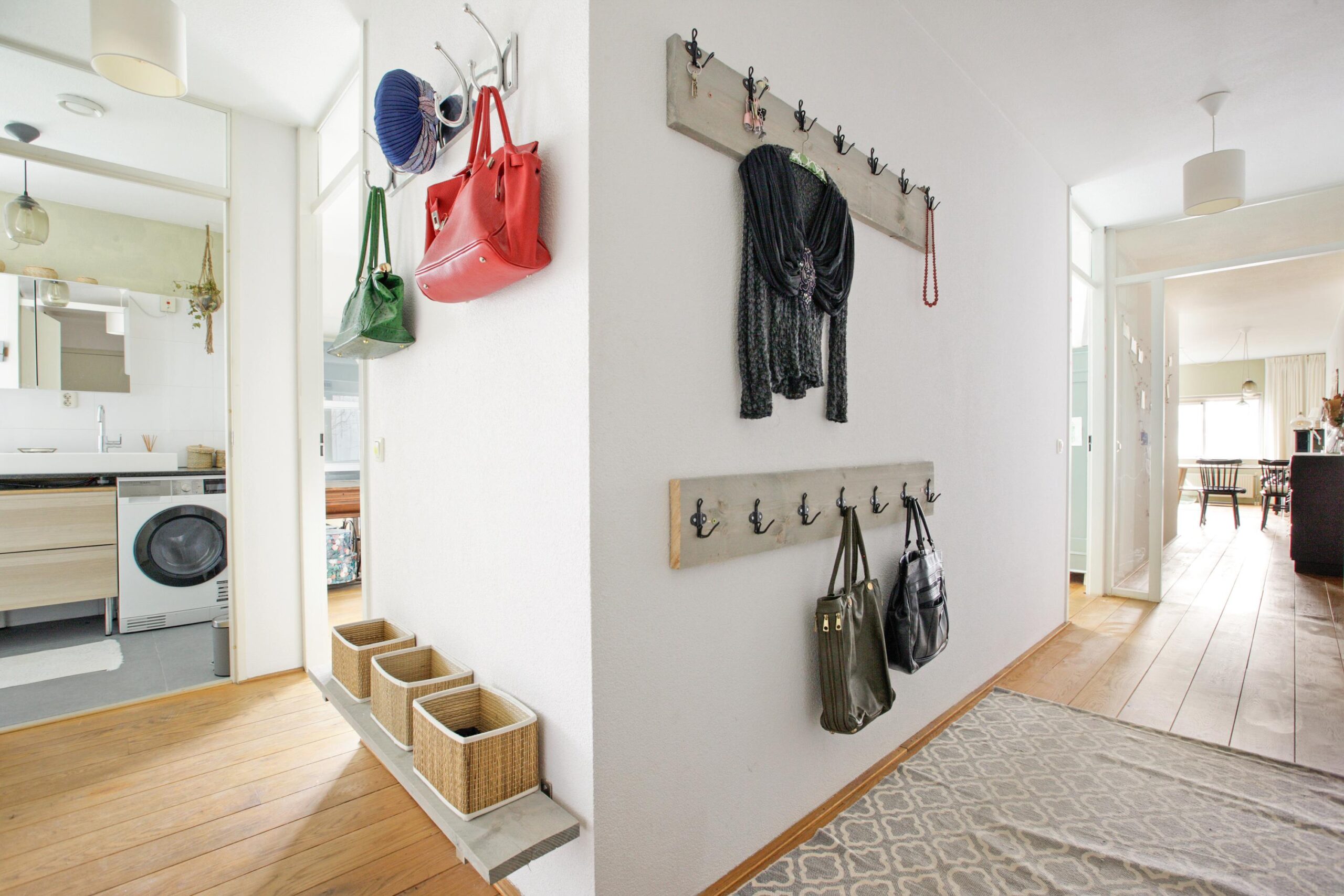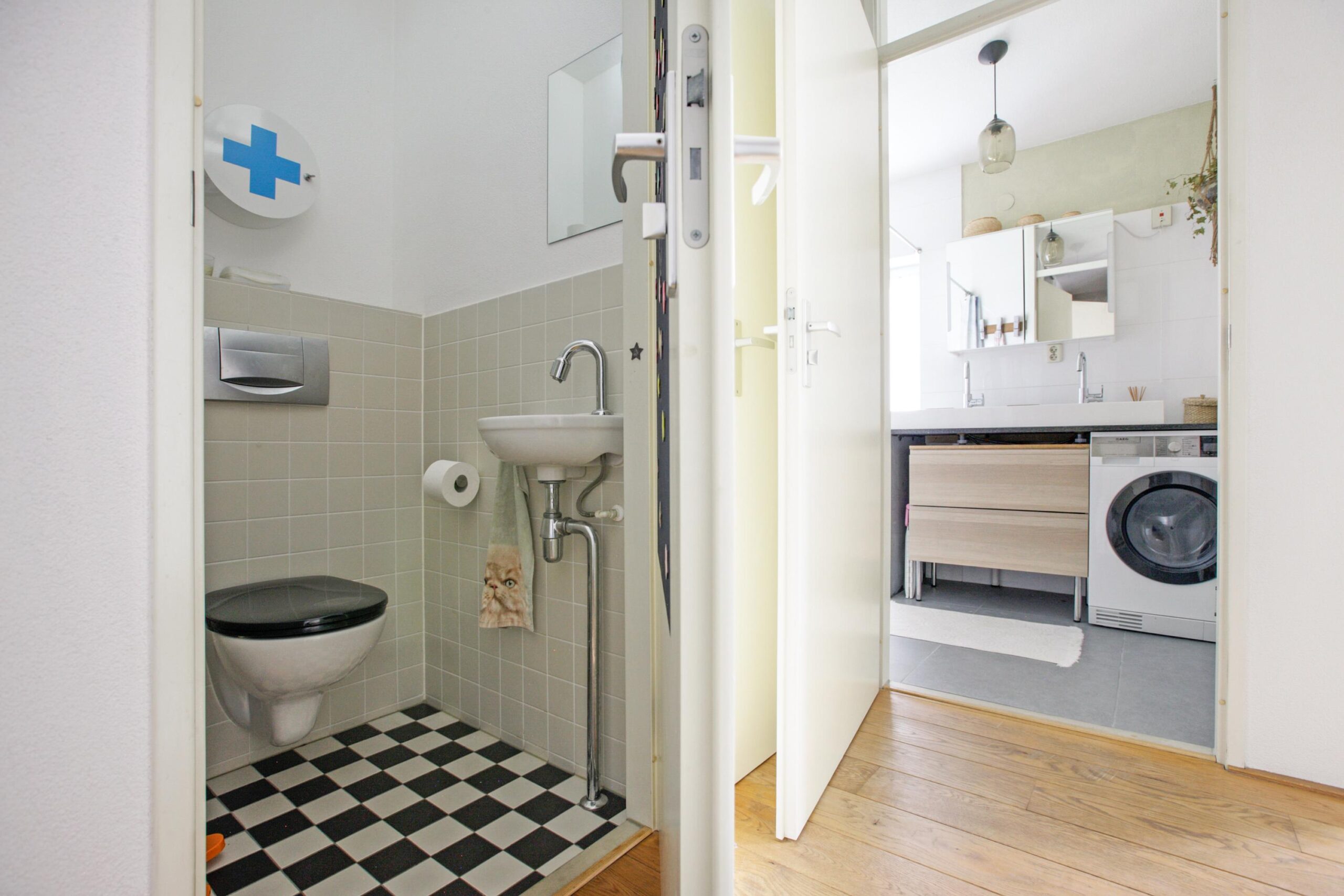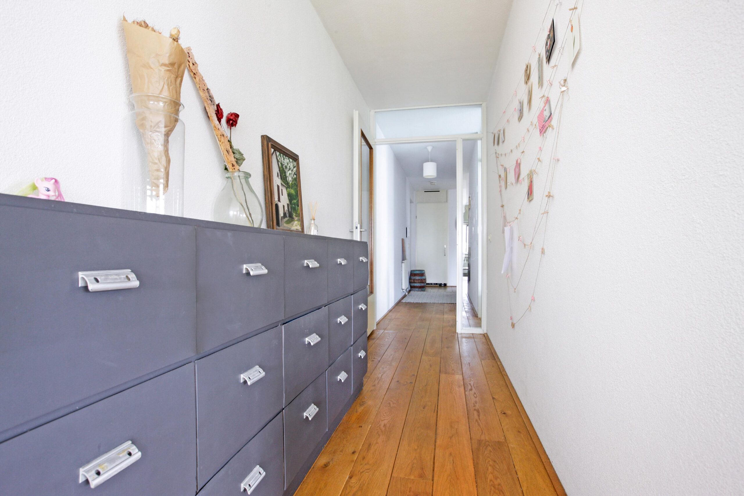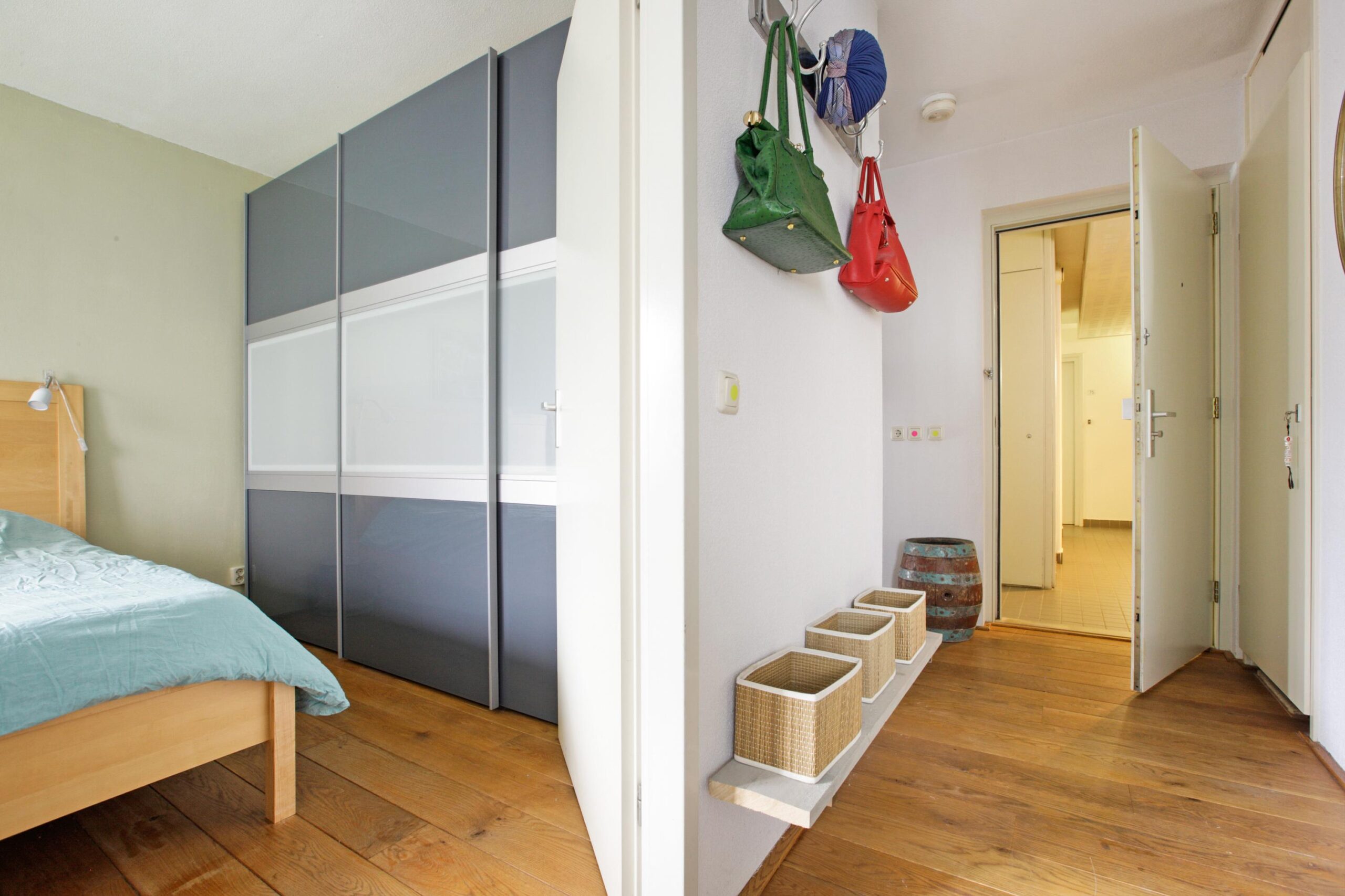 Op de tweede verdieping betreedt u het appartement via de hal. Aan de rechterzijde vindt u de lichte woonkamer met grote raampartijen dankzij de hoekligging. De open keuken is voorzien van alle benodigde inbouwapparatuur en biedt toegang tot het westelijk gelegen balkon.