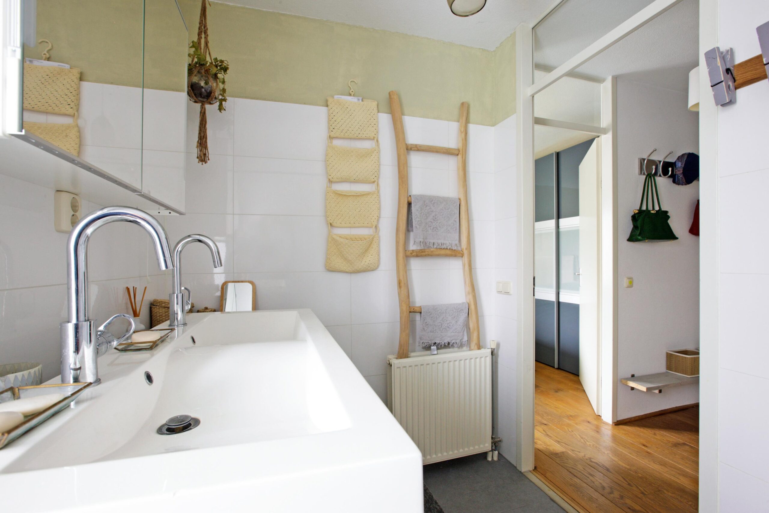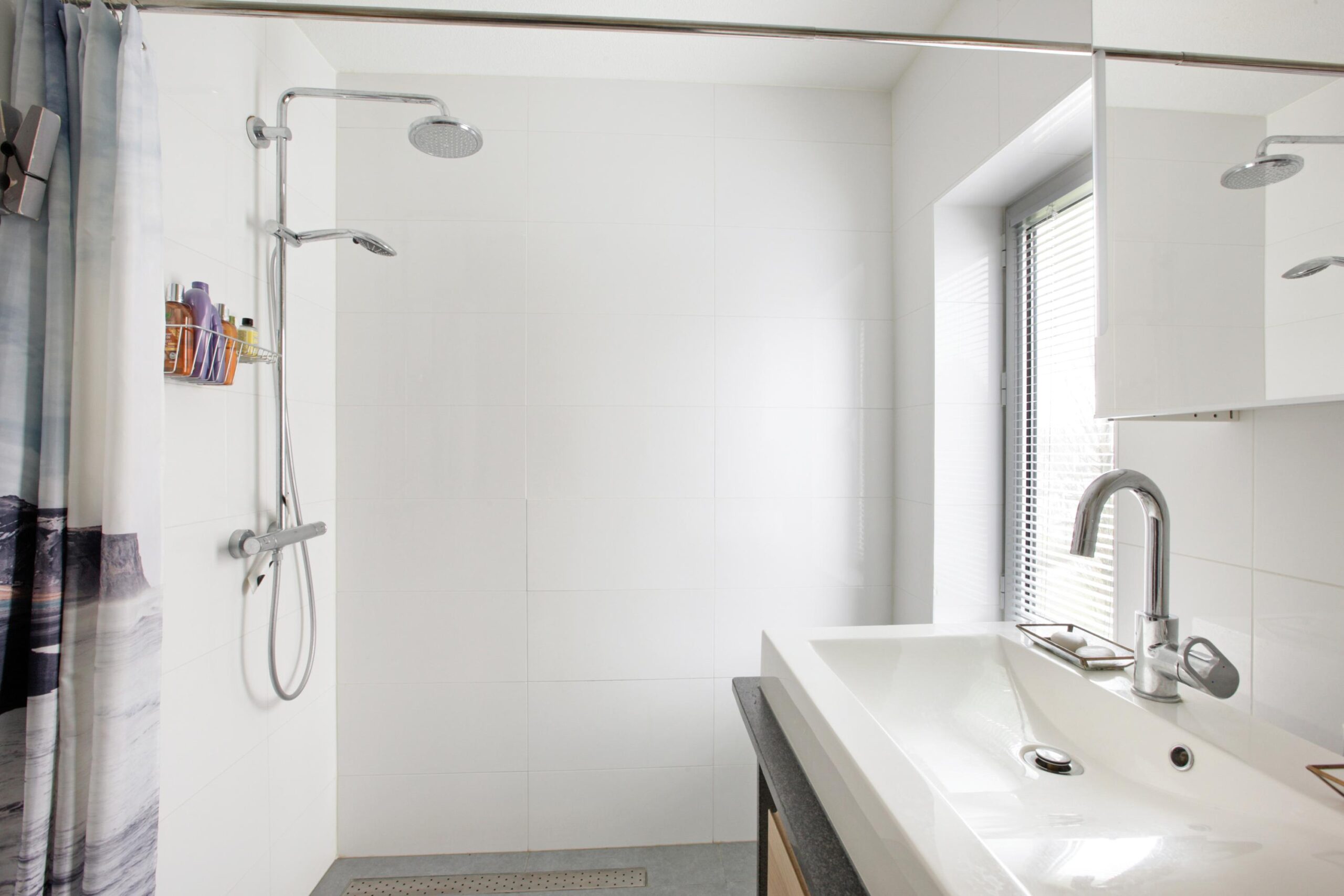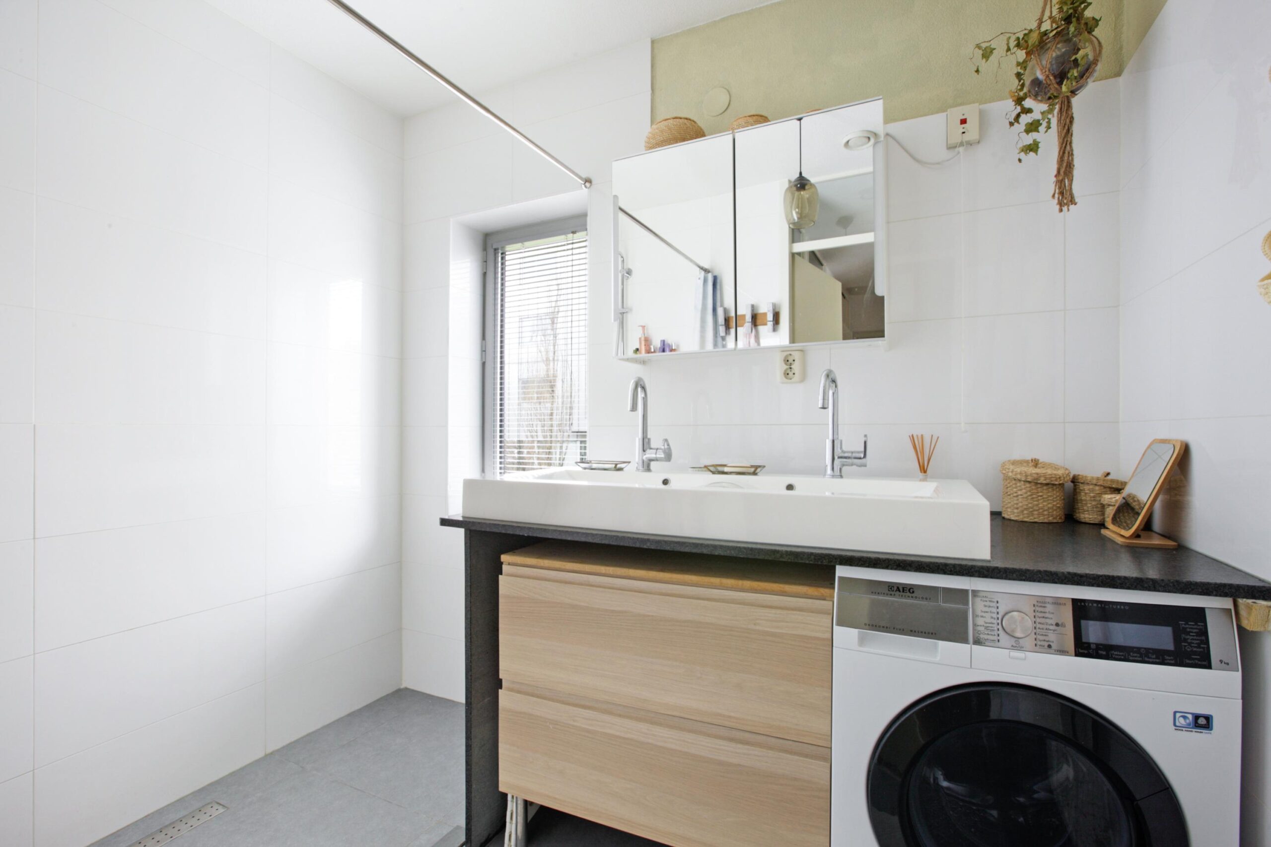 Verder in de hal ligt de tweede (master) slaapkamer met een ruime kast. Naast deze slaapkamer bevindt zich de badkamer met een inloopdouche, dubbele wastafel en een was-droogcombinatie. In de hal bevindt zich tevens een separaat toilet.