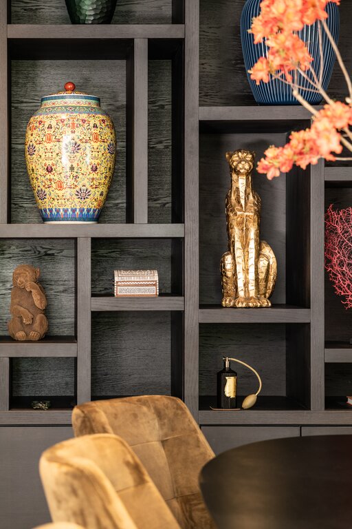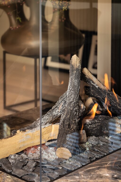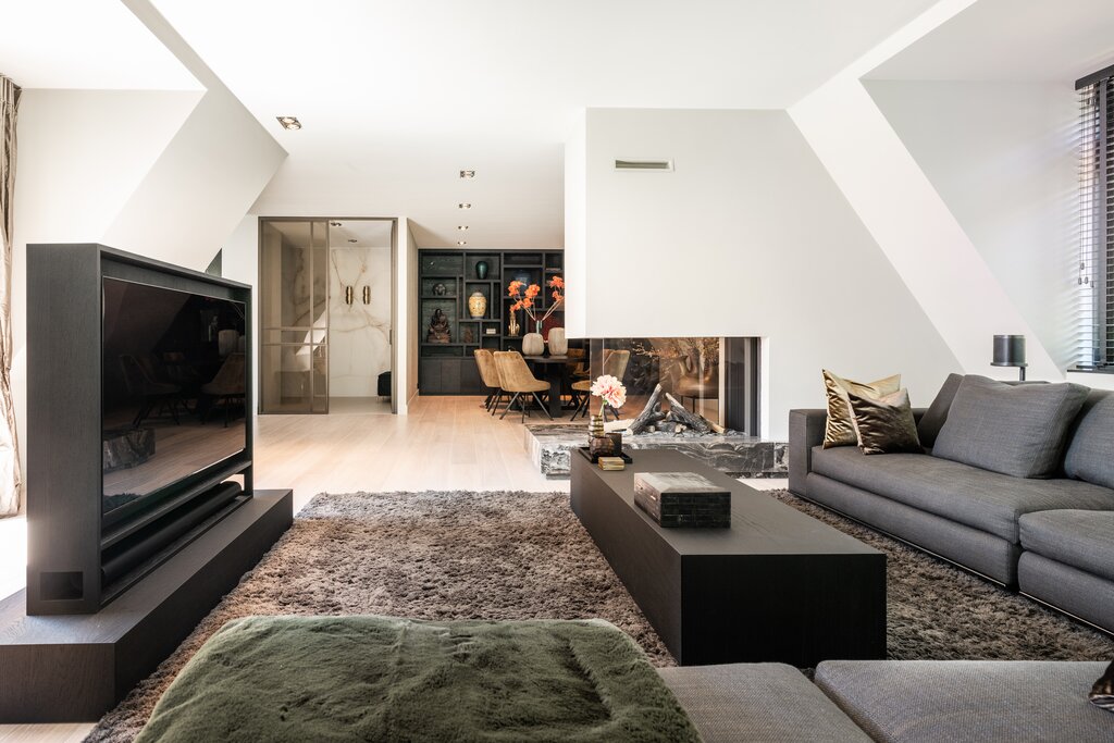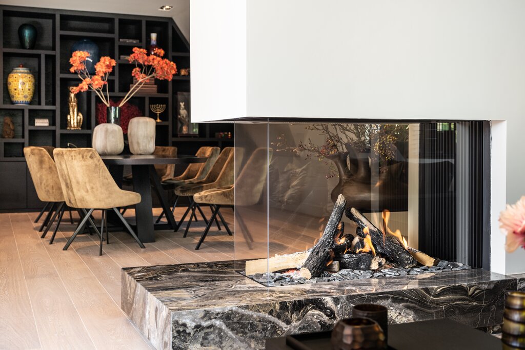 De riante leefomgeving waar de living en de eetkamer zich bevinden is verdeeld door een lange hoge gashaard welke omlijst is met oberiqo marmer.