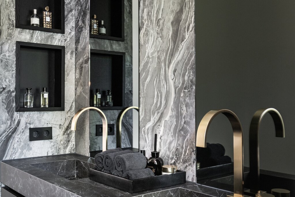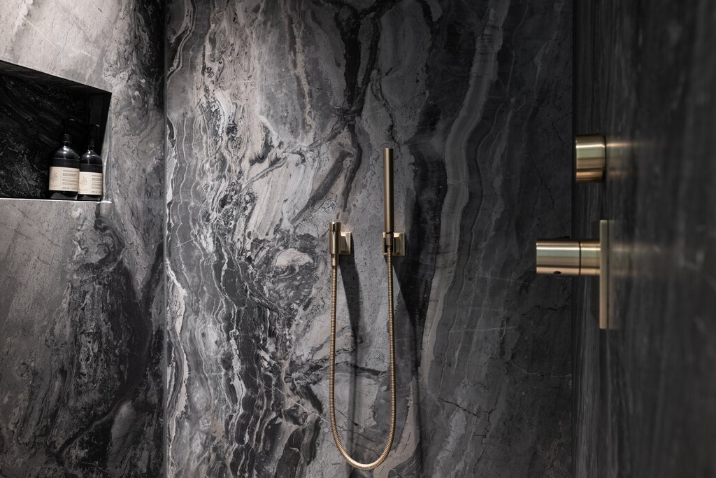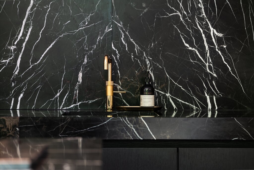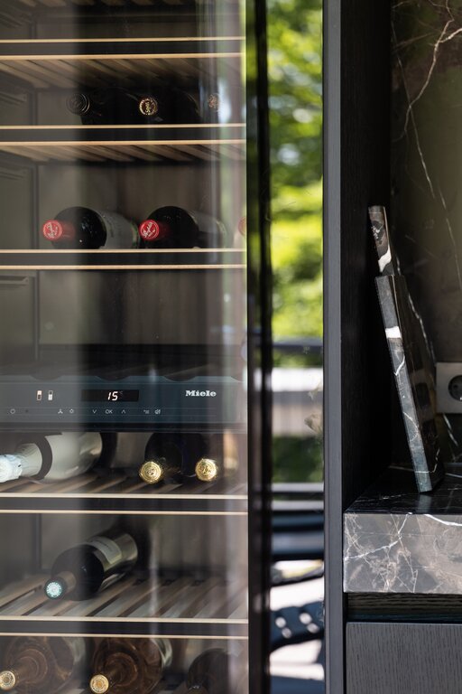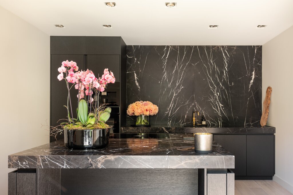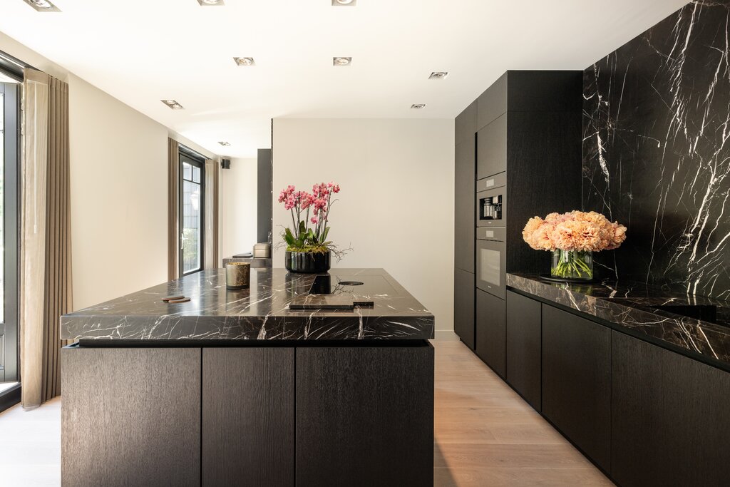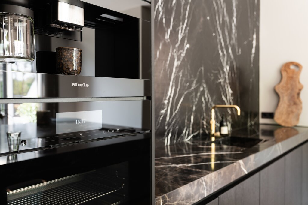 De prachtige maatwerk keuken met kookeiland is afgewerkt met een luxe brown leather marmeren blad en muren. De keuken is voorzien van alle benodigde inbouw apparatuur zoals o.a. een 4-pits inductie kookplaat incl. geïntegreerde afzuiging, Miele combi stoomoven, Miele koffiemachine, Miele afwasmachine, koelkast, vriezer en een gouden Quooker heet waterkraan. Voor de echte liefhebber is tevens een Miele wijnklimaatkast toegevoegd aan deze prachtige keuken.