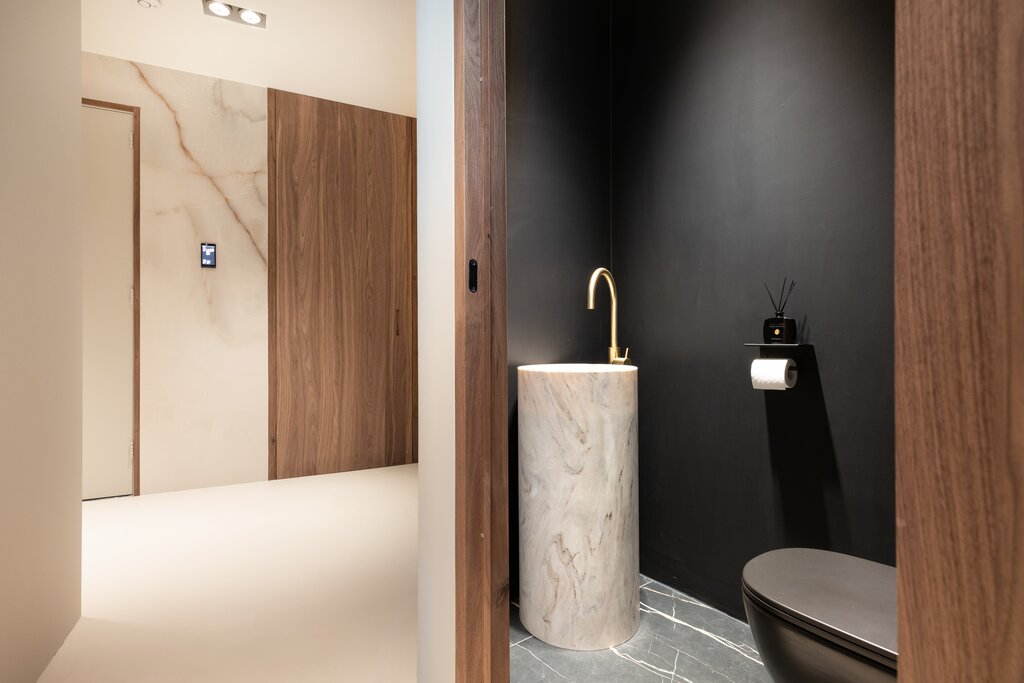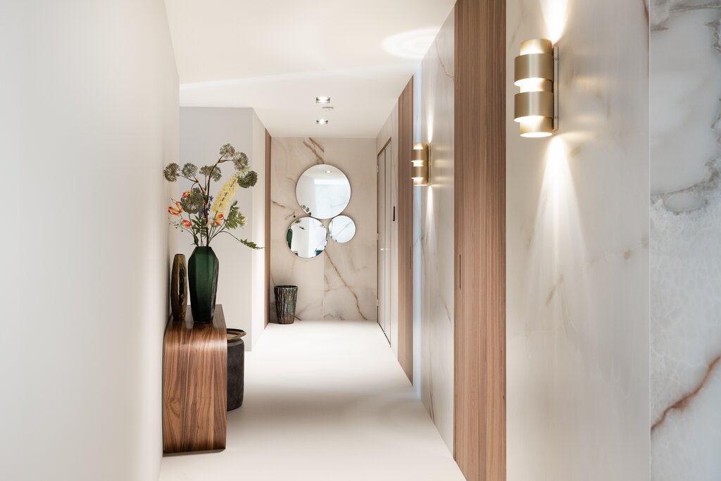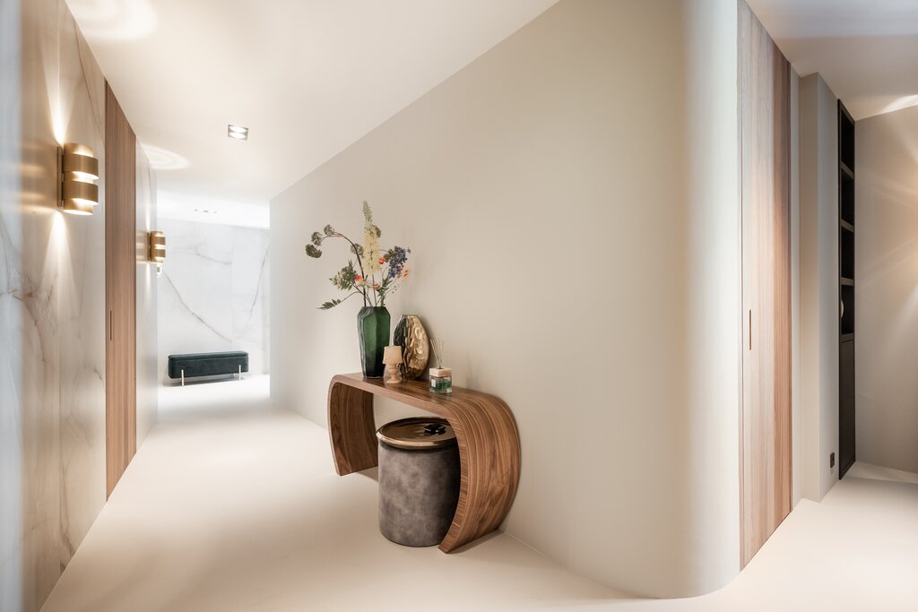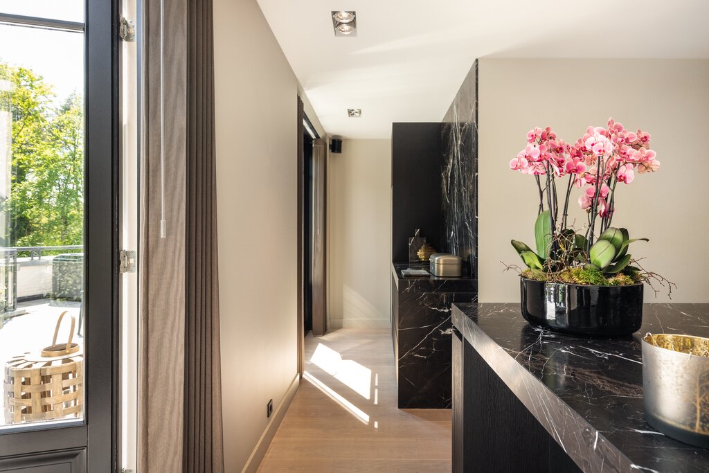 Middels de lift bereikt u dit prachtige penthouse gelegen op de 2e etage. De ruim 10 meter centrale hal is een ware eyecatcher. Via deze hal heeft u toegang tot de diverse vertrekken van de woning. De hal is voorzien van circa 3 meter hoge onyx wandtegels. Alle deuren in de hal zijn gemaakt van Amerikaans notenhout. Dit geeft een unieke en bijzondere uitstraling. De hoogte van de deuren geven een ruimtelijke beleving. Grenzend aan deze hal vindt u tevens het separate gastentoilet, de garderobe en de interne berging/wasruimte.