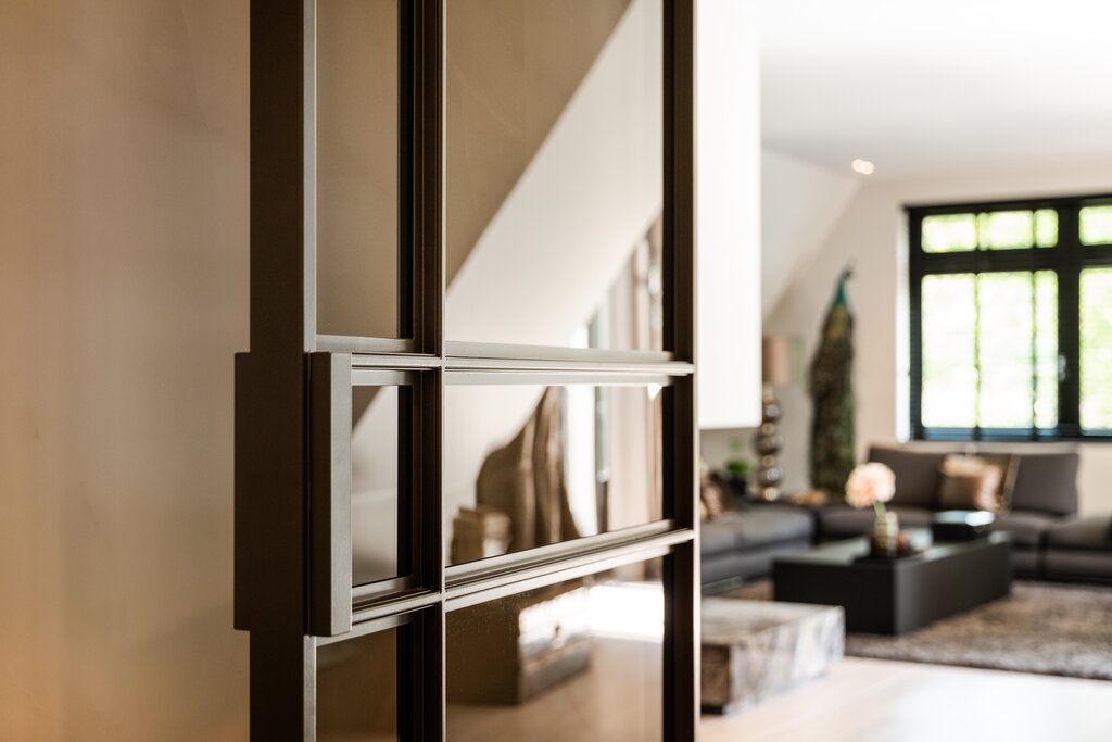 U vervolgt u weg naar de westzijde van het appartement, waar u via de twee mooie stalen tussendeuren terecht komt in de living van de woning. Direct bij binnenkomst valt het open en lichte karakter van de woning op, veroorzaakt door de vele raampartijen én hoekligging van de woning