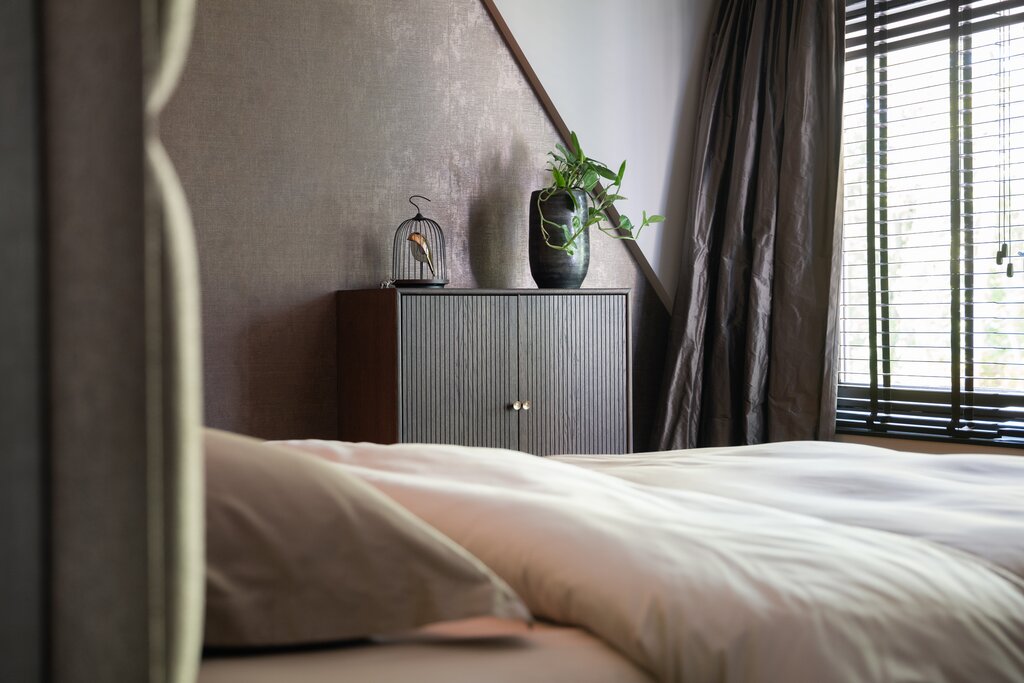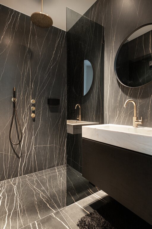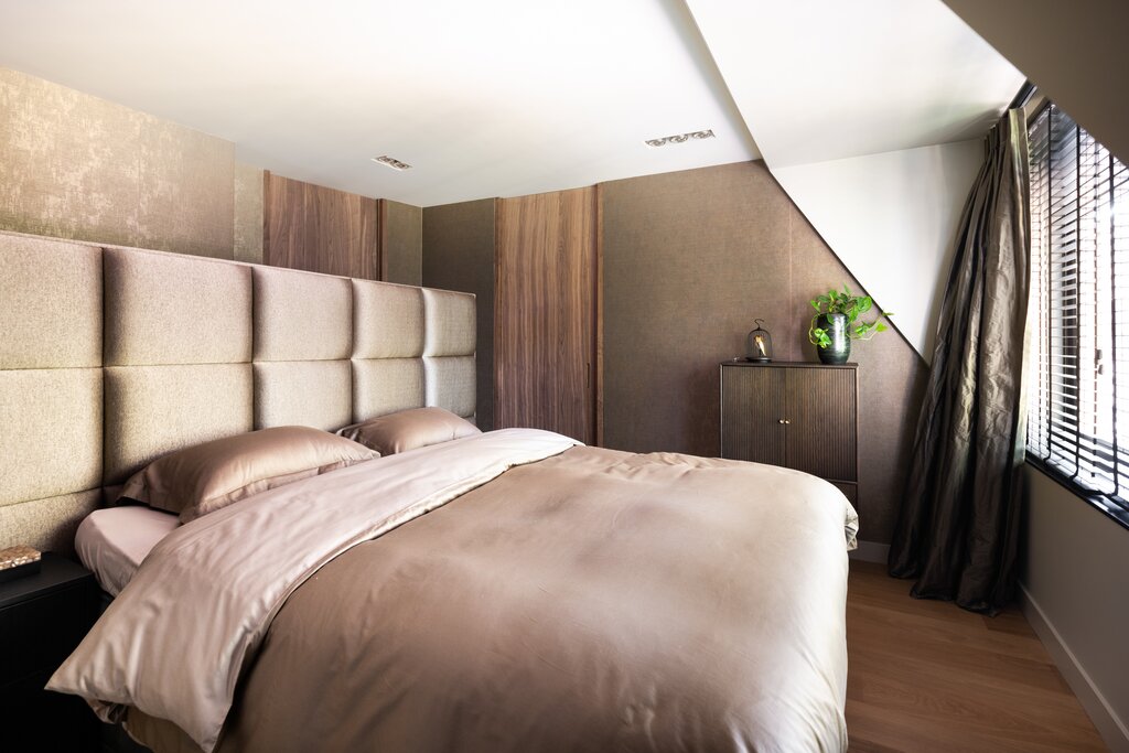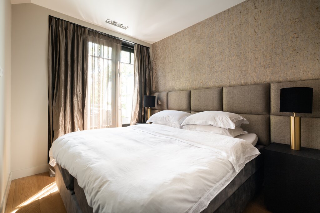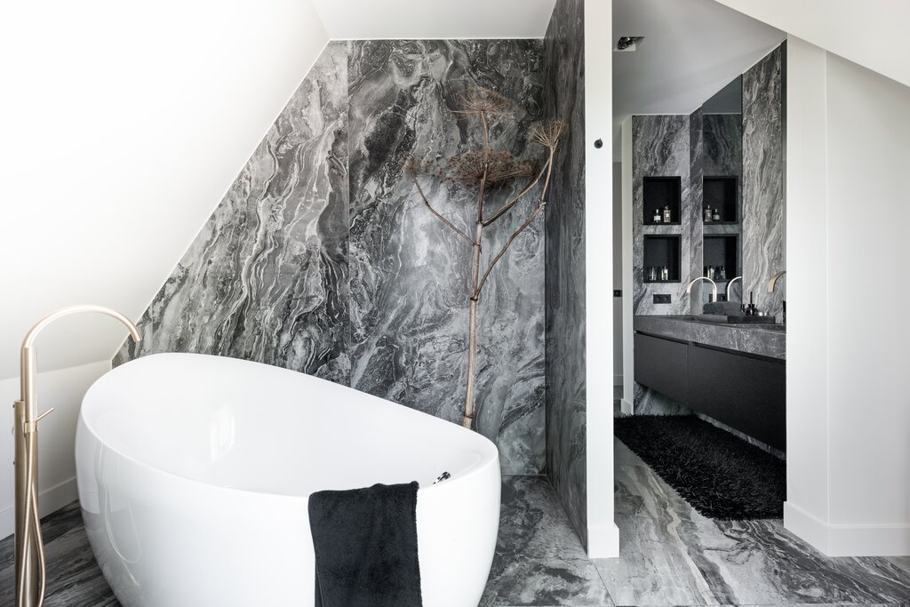 De master-bedroom van de woning ligt aan de “koele” noordzijde van de woning. Grenzend aan de master-bedroom vindt u een zeer smaakvolle badkamer met hoogwaardige afwerking. De riante badkamer is voorzien van een douchetoilet, een groot ligbad, inloop regendouche, handdouche en dubbele wastafel met meubel. Naast deze slaapkamer vindt u de Italiaanse design walk-in-closet.