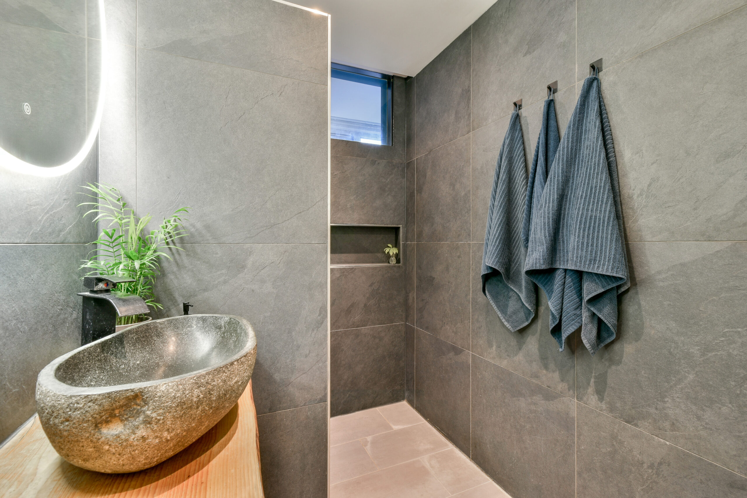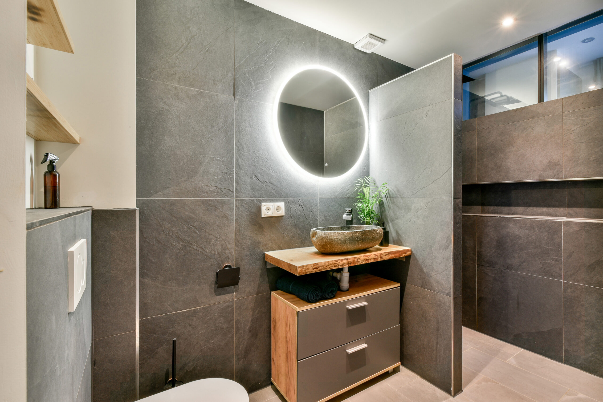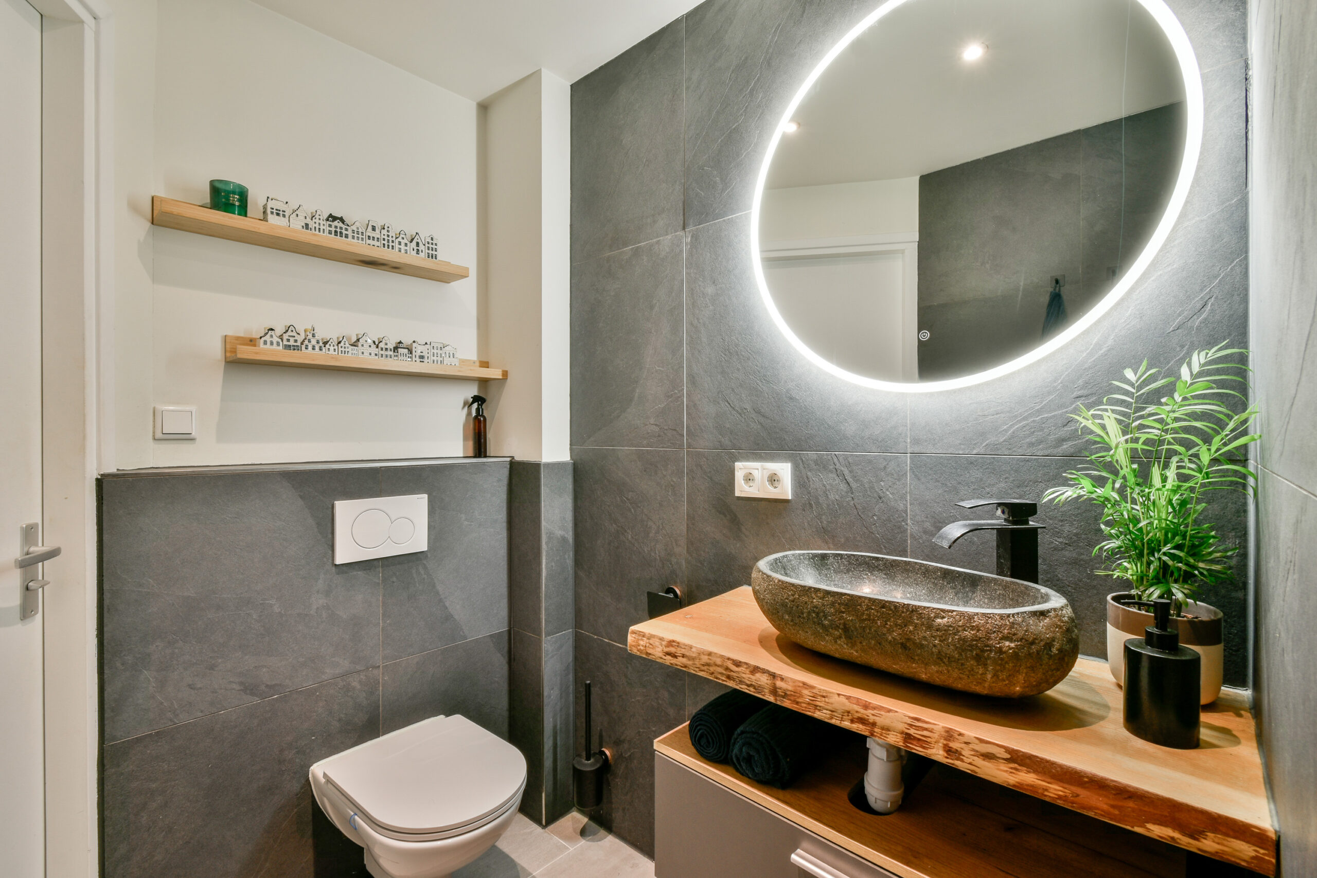 Centraal in de woning ligt de moderne badkamer (vernieuwd in 2021), voorzien van een toilet, wastafelmeubel en een comfortabele inloopdouche.