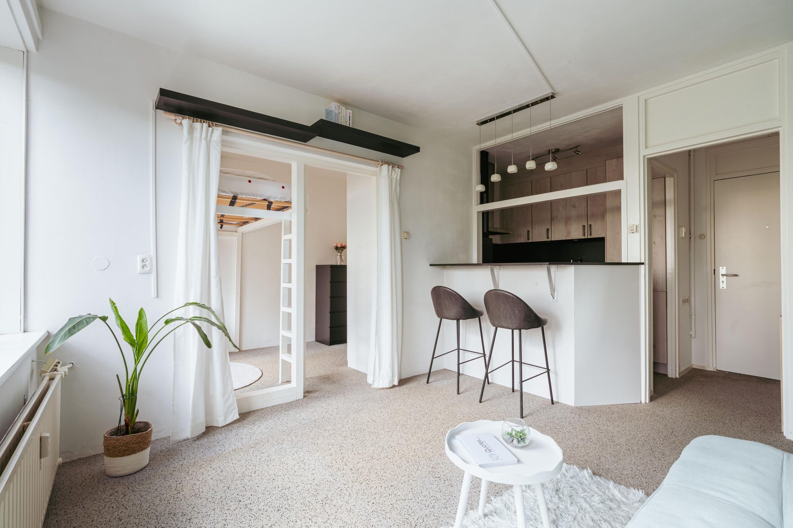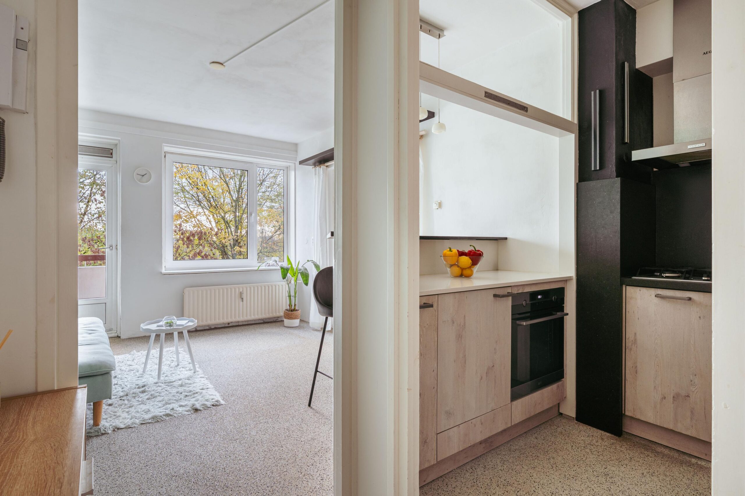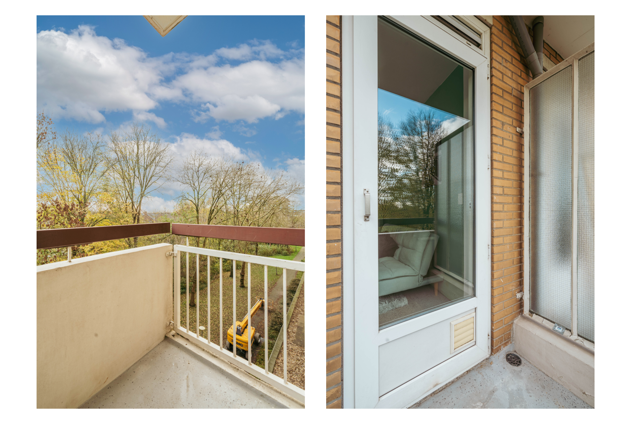 Op de vijfde verdieping stap je binnen in een licht appartement van 34 m² met grote ramen en een rustig uitzicht op het groen. Vanuit de woonkamer loop je direct het balkon op, een knus buitenplekje op het zuiden waar je geniet van de middag- en avondzon.