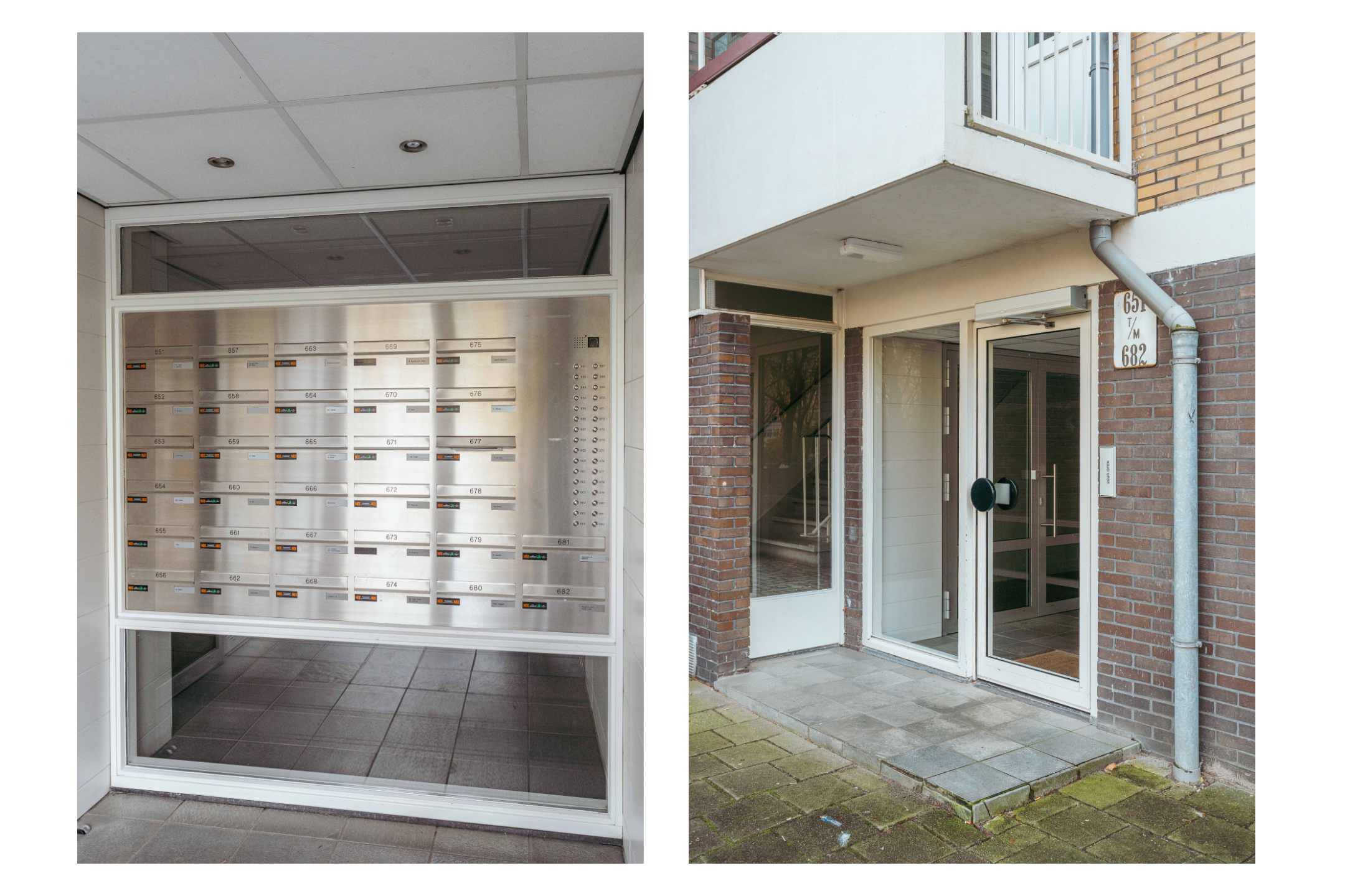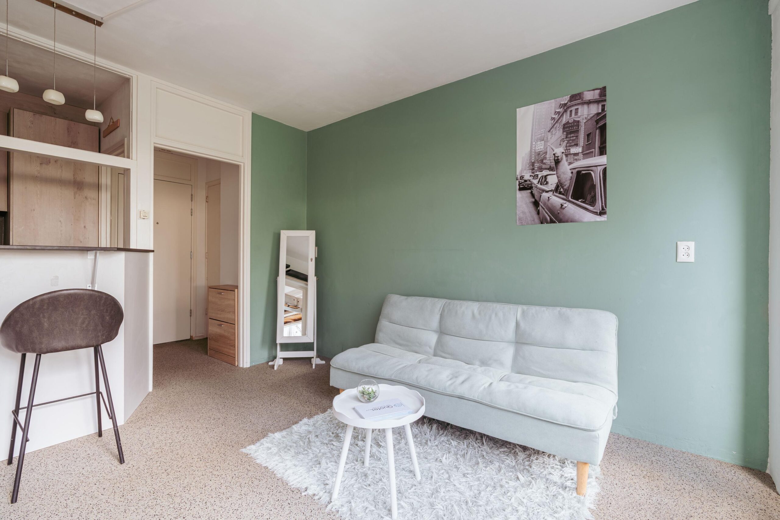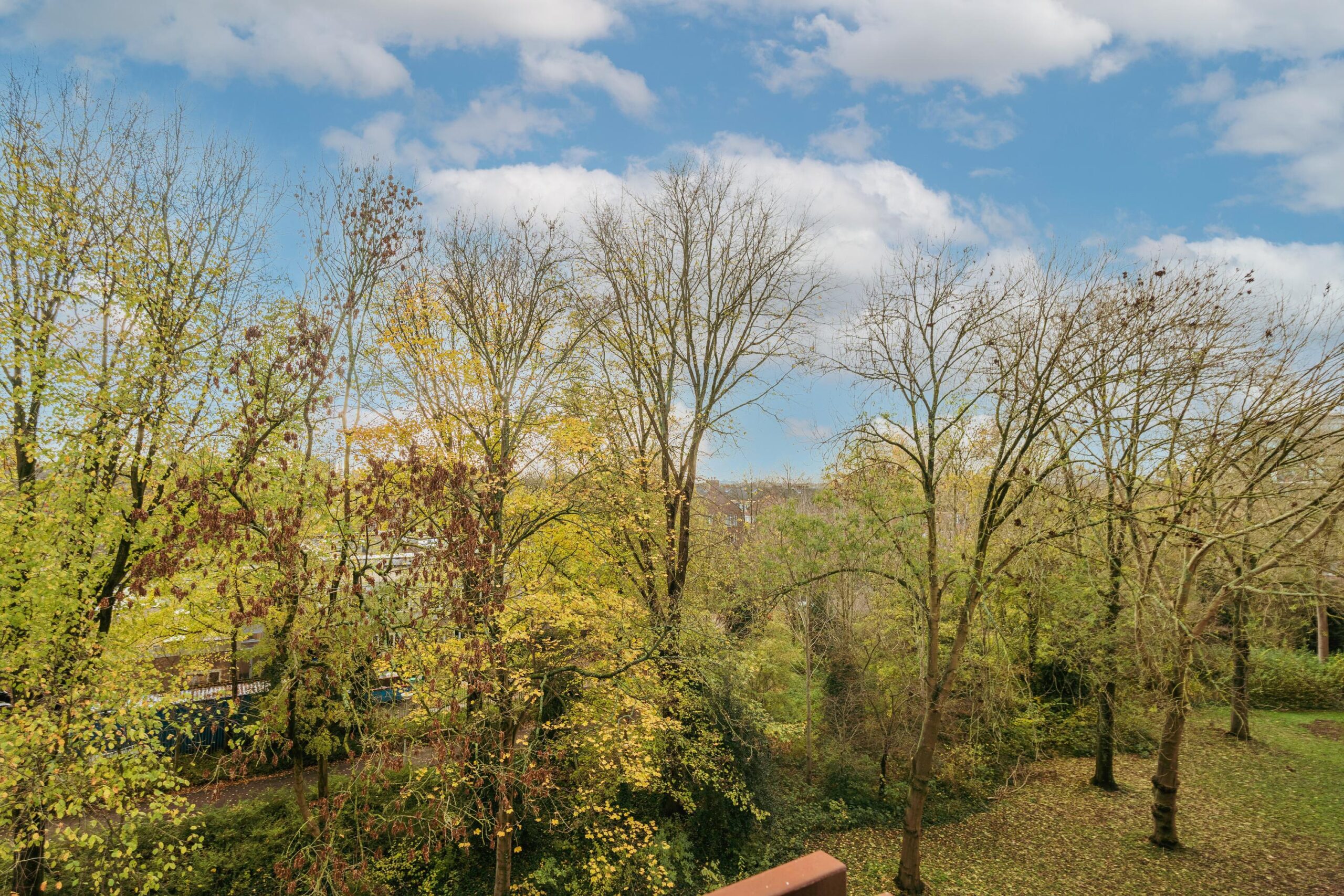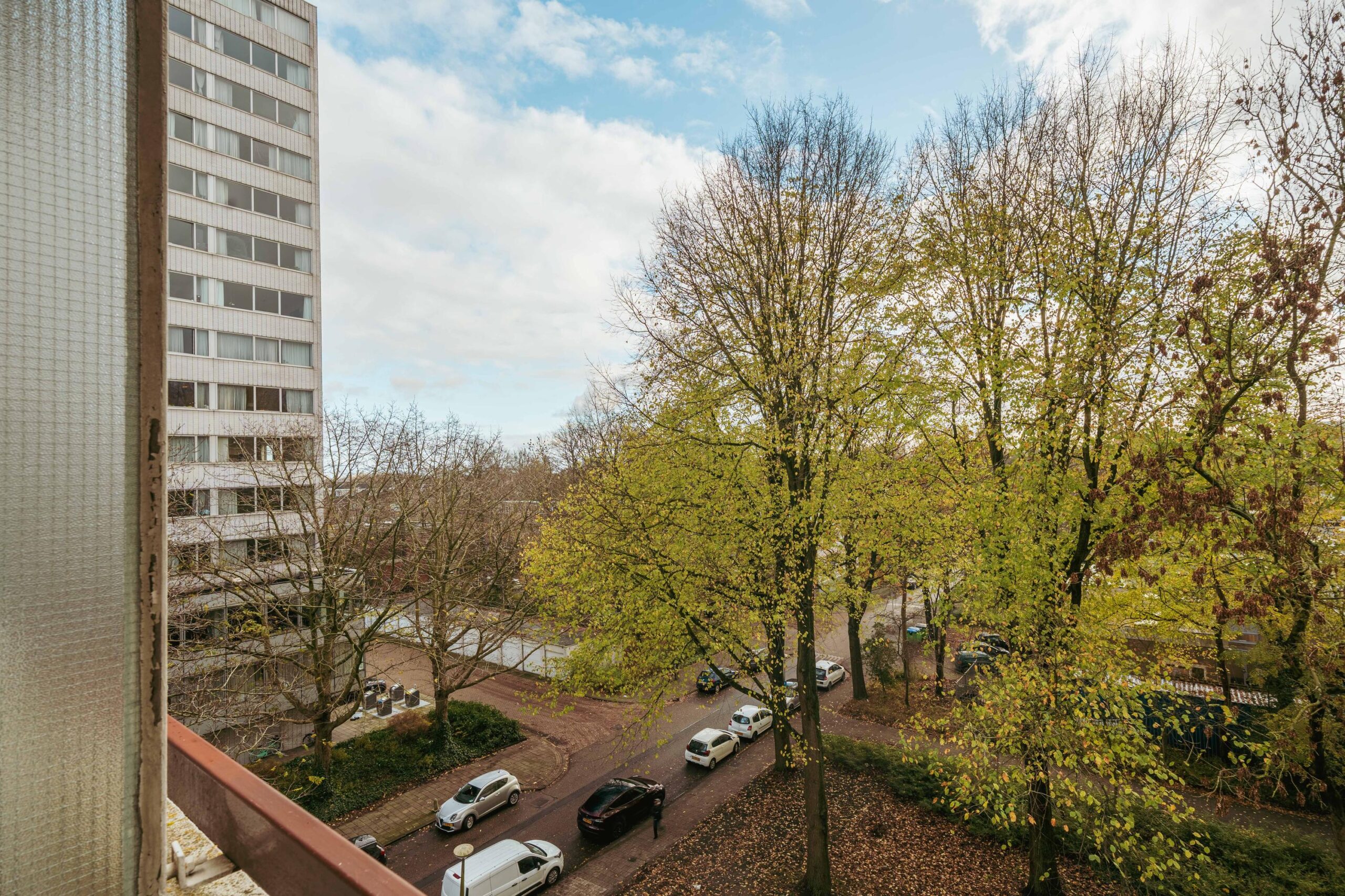 Op de vijfde verdieping stap je binnen in een licht appartement van 34 m² met grote ramen en een rustig uitzicht op het groen. Vanuit de woonkamer loop je direct het balkon op, een knus buitenplekje op het zuiden waar je geniet van de middag- en avondzon.
