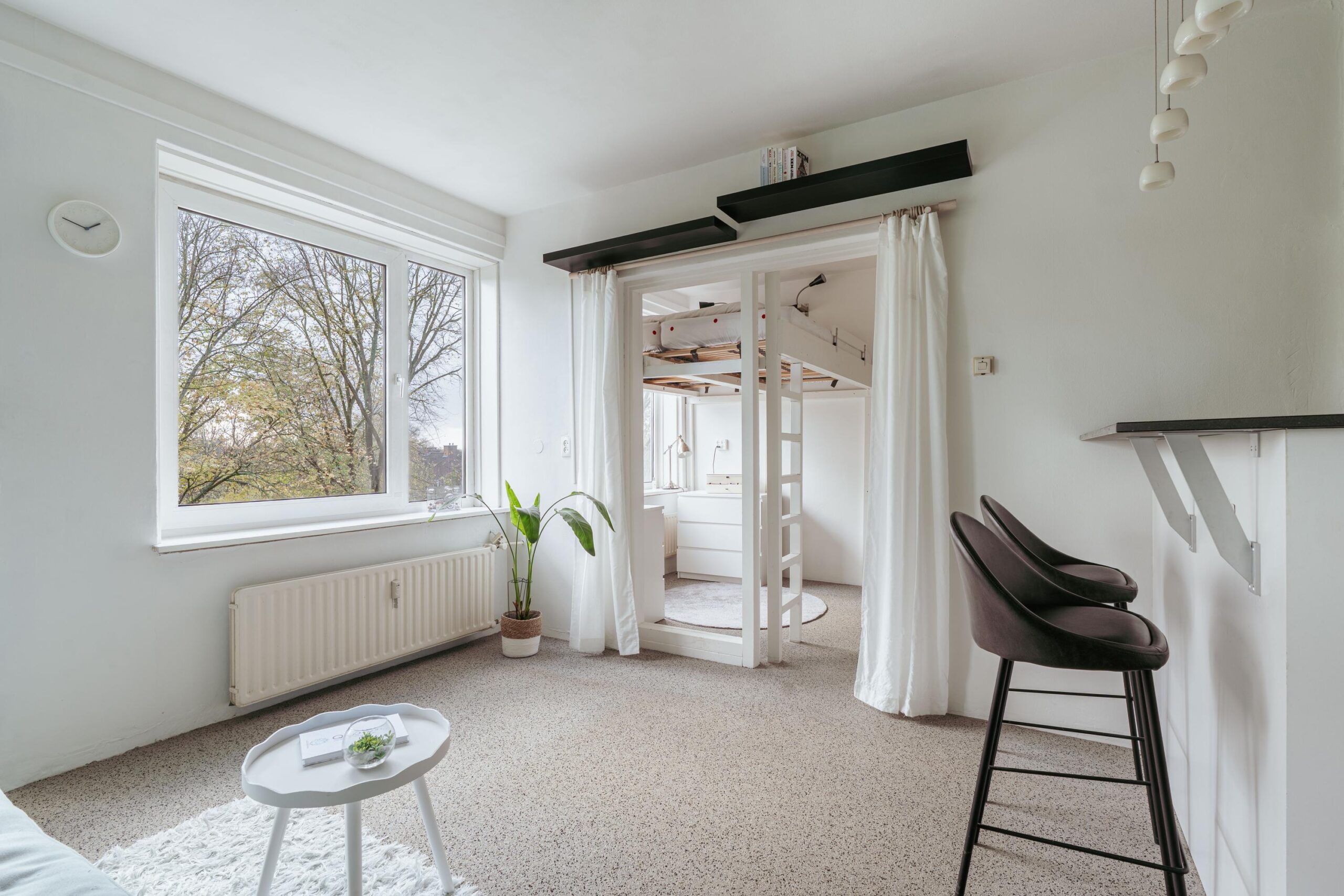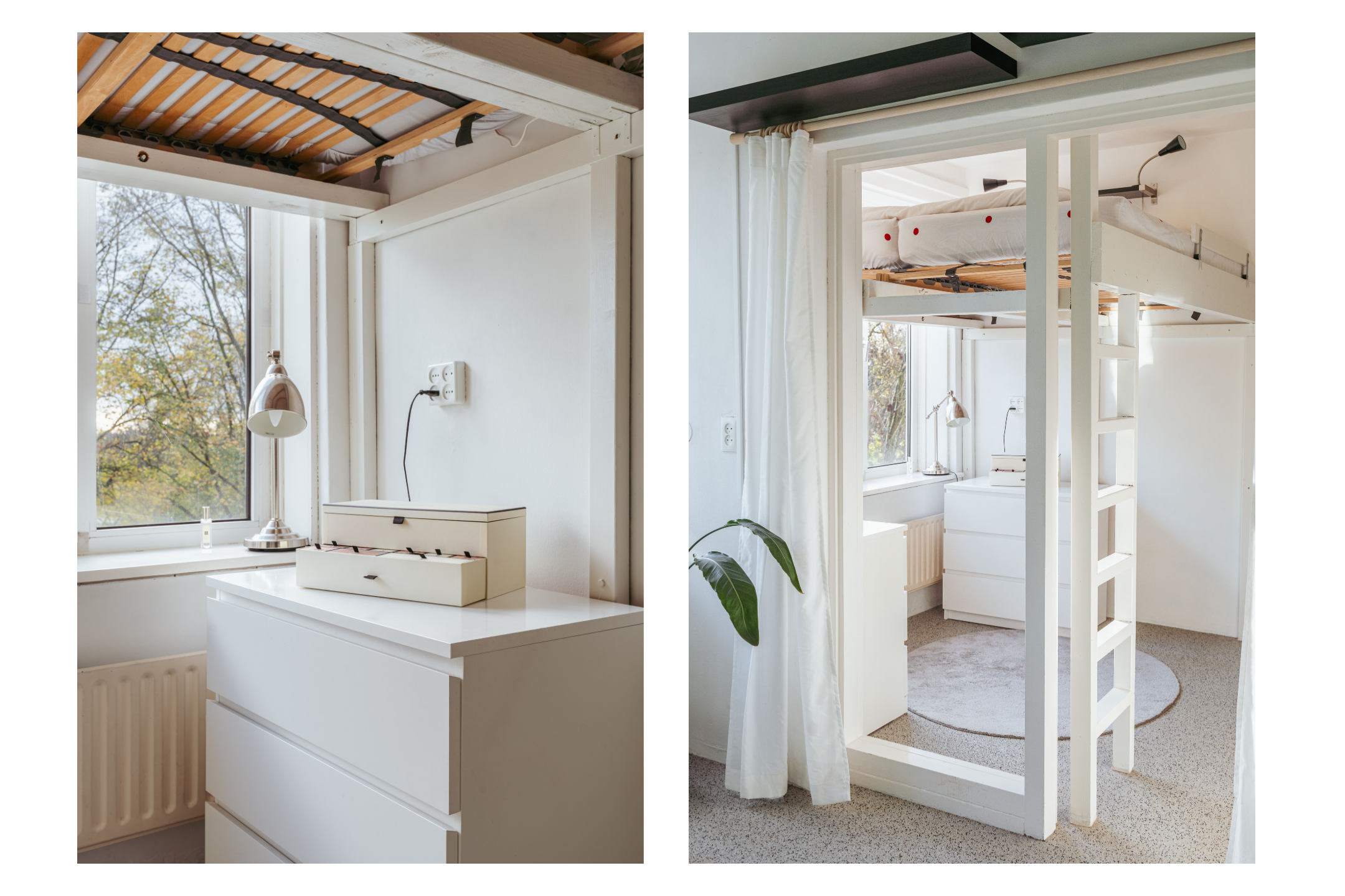 The bedroom is open-plan yet cleverly partitioned, creating a pleasant balance between privacy and space. The loft bed below creates additional space, ideal as a home office, laundry area, or relaxation area.