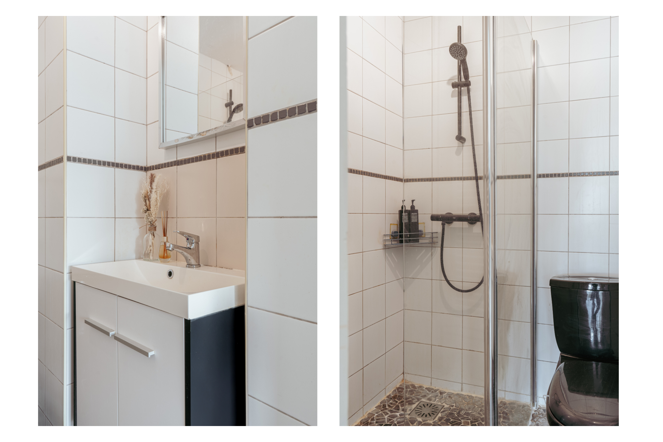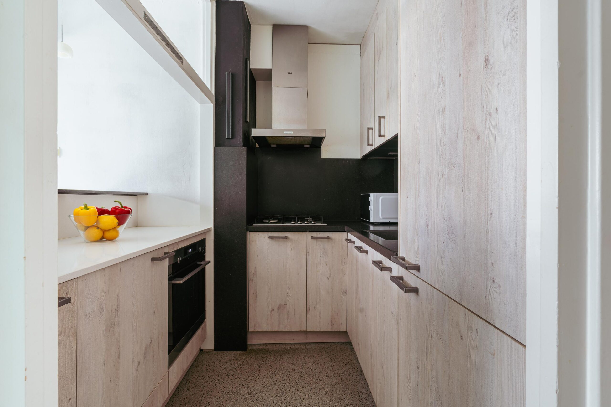 De keuken is modern uitgevoerd in warme houttinten en voorzien van veel opbergruimte, een gaskookplaat, oven, afzuigkap en een strak werkblad. De badkamer is compact maar verzorgd, met douche, toilet en wastafel.