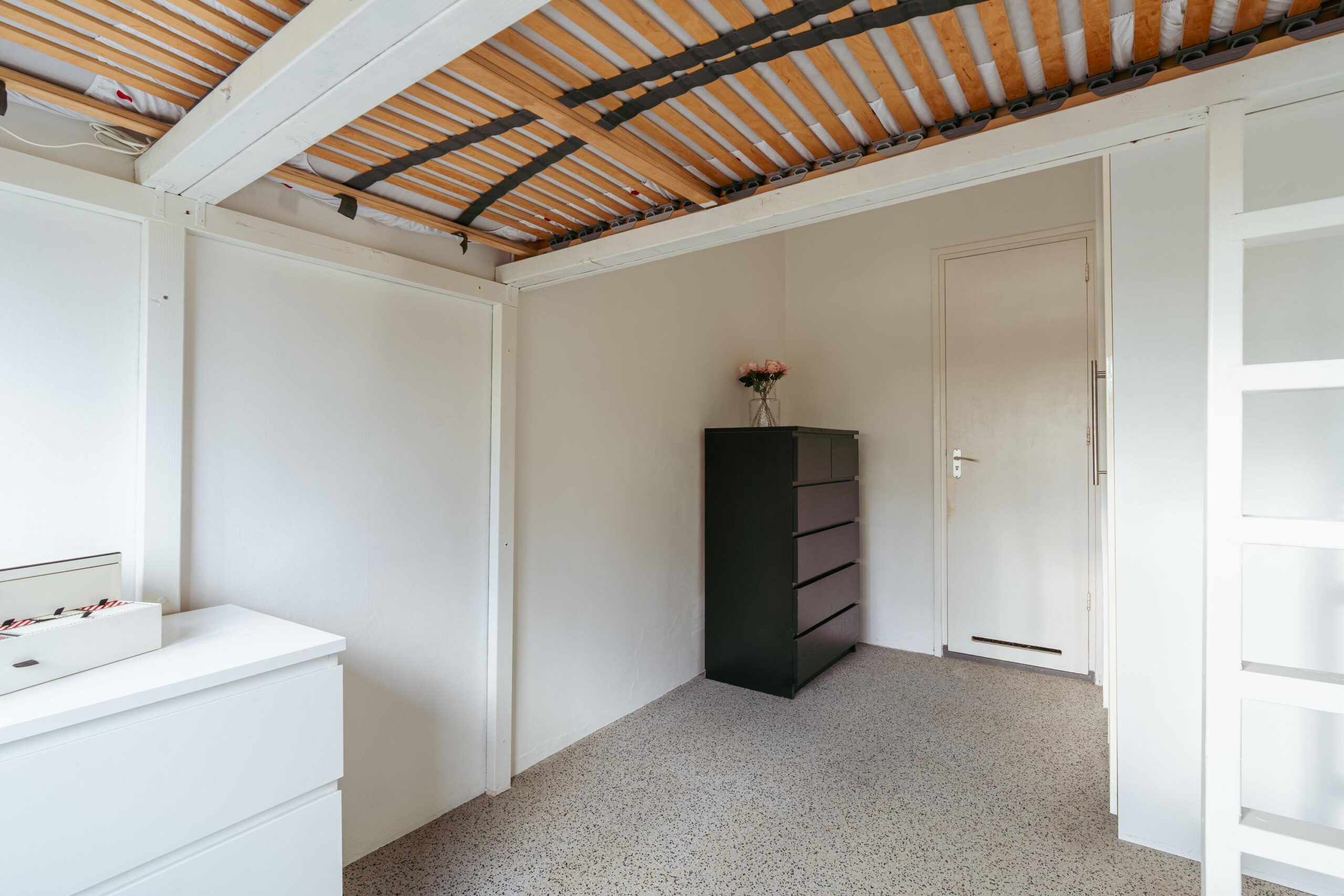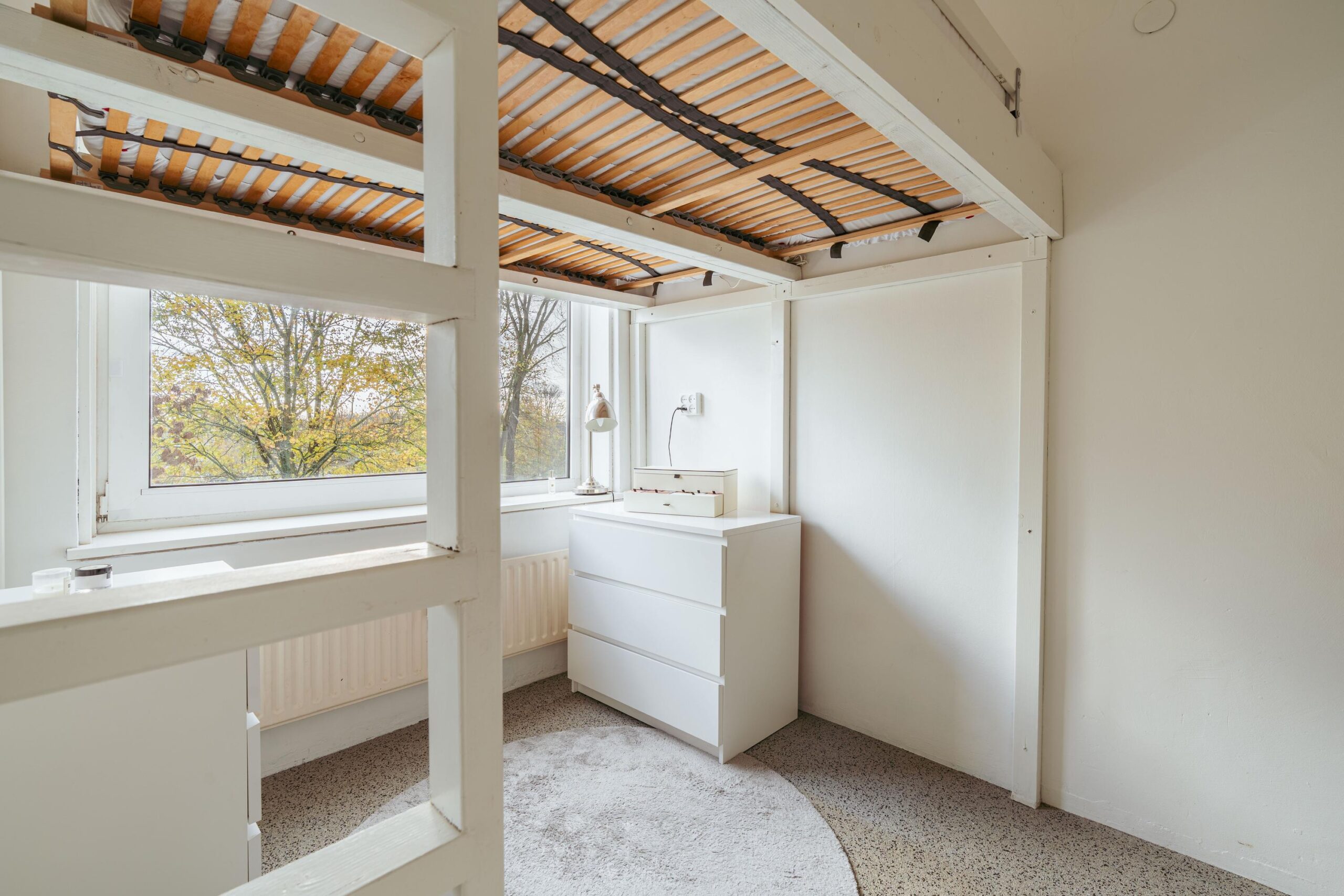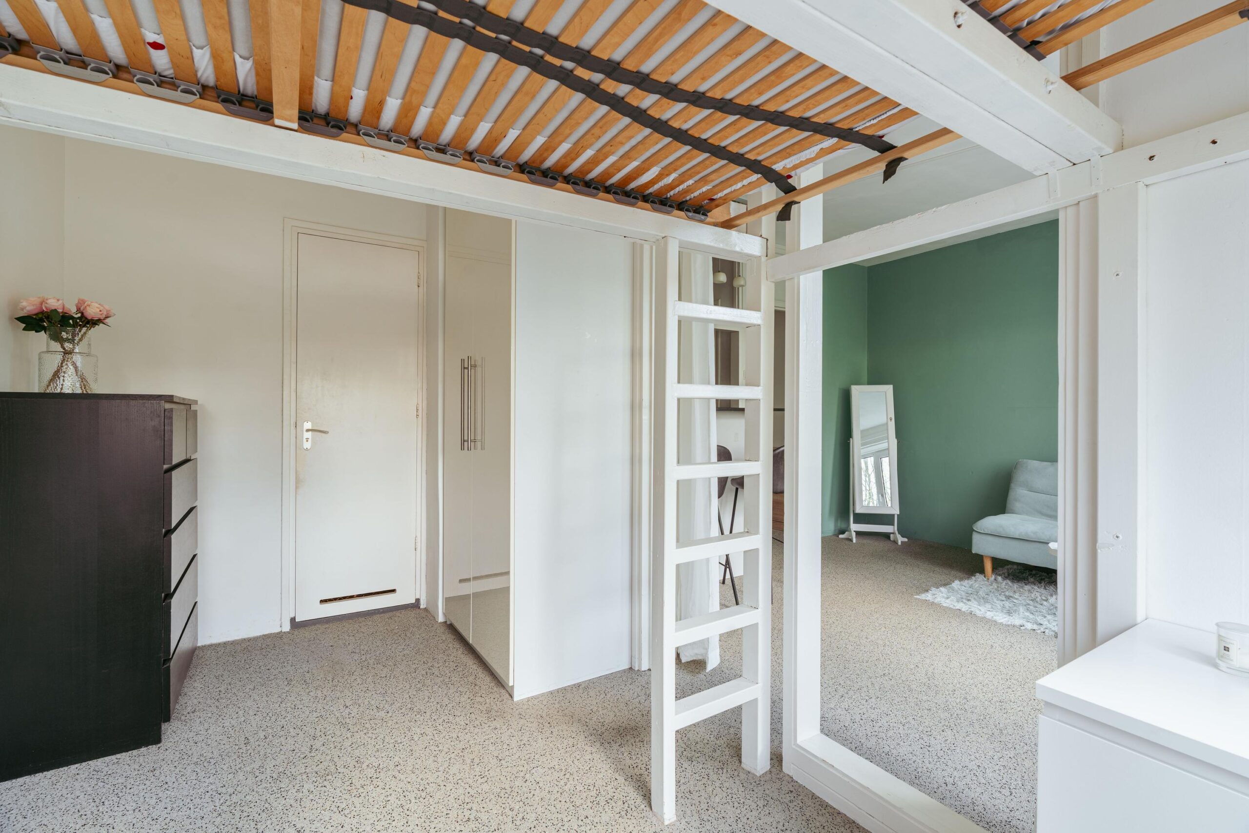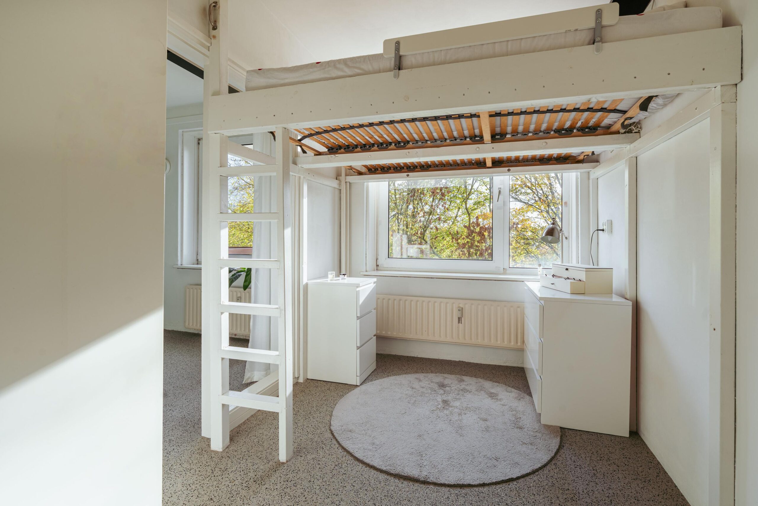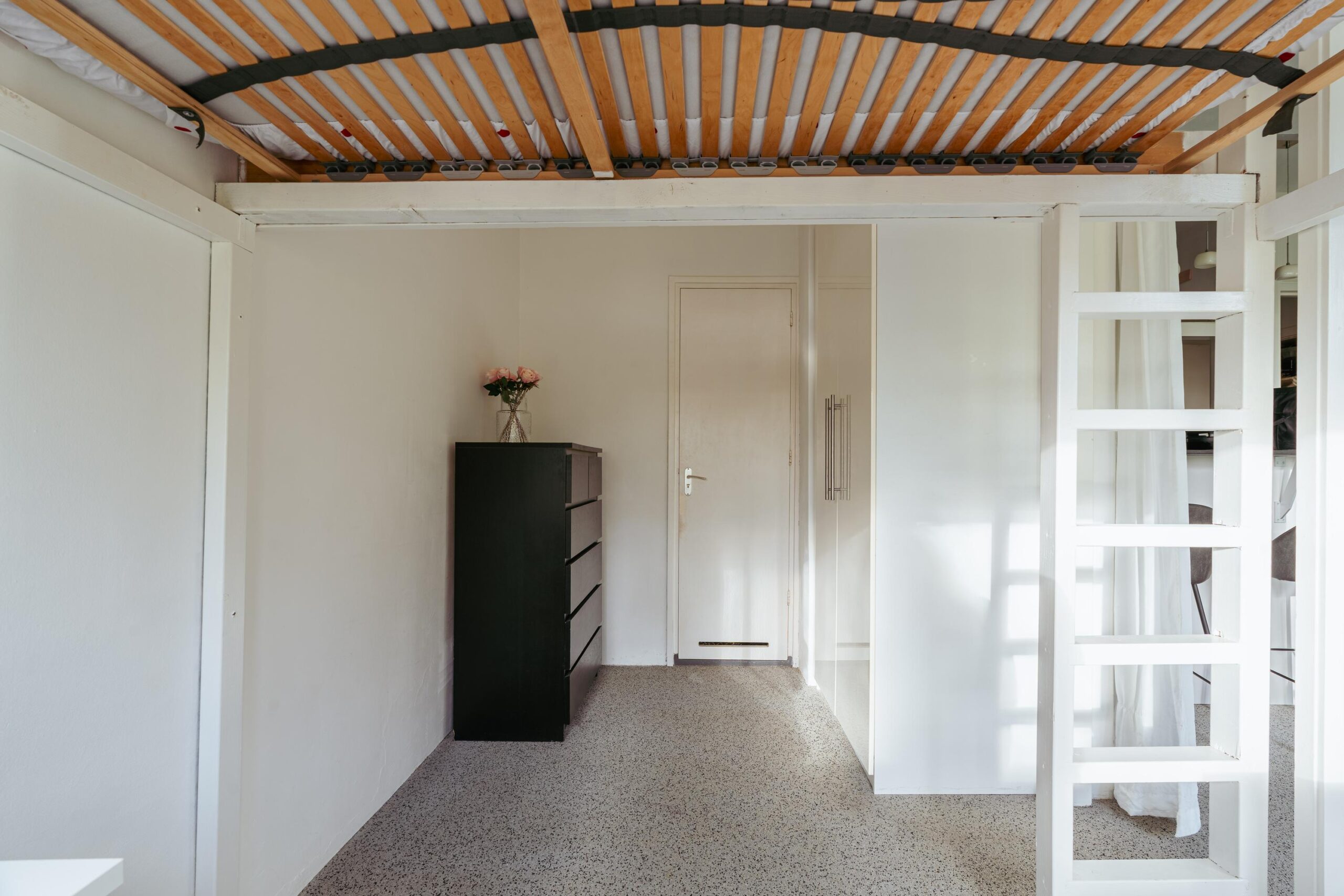De slaapkamer is open maar slim afgescheiden, waardoor er een prettige balans ontstaat tussen privacy en ruimte. De hoogslaper creëert extra vierkante meters eronder, ideaal als thuiswerkplek, kledinggedeelte of relaxhoek.